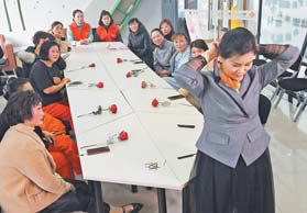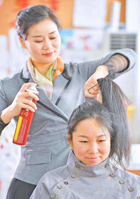 化妆师为环卫女工做发型。通讯员吴秉益摄
