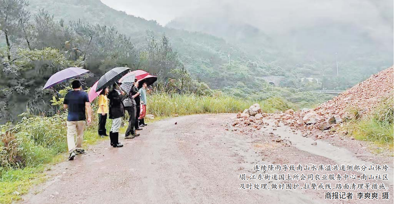 连续降雨导致南山水库溢洪道侧部分山体垮塌,江东街道国土所会同农业服务中心、南山社区及时处理,做好围护、拉警戒线、路面清理等措施。义乌商报记者李爽爽摄