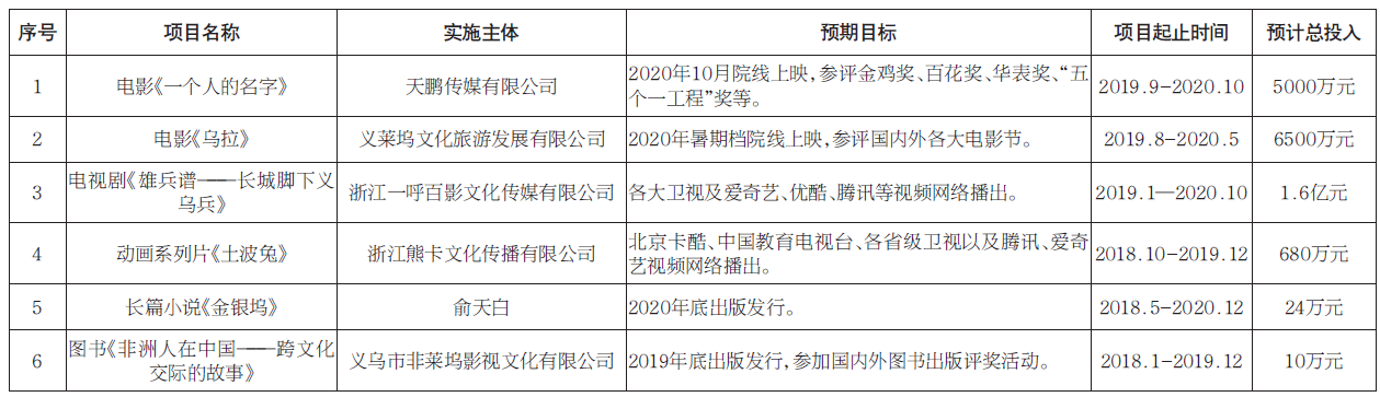 为推动我市文化精品工程建设,鼓励创作一批以人民为中心,展示义乌城市形象和发展成就的文艺精品,讲好义乌故事,发出义乌好声音,根据《义乌市文化精品工程扶持奖励办法》(义政办发[2015]102号)精神,市文化精品建设领导小组办公室组织开展了2019年度扶持项目的申报、筛选和评审工作。现将2019年度拟扶持项目名单向社会公示,公示时间为2019年11月5日至11月7日。如对拟扶持项目有异议,请在公示期间与市精品办联系。