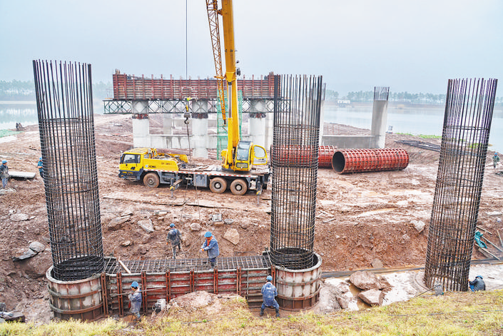 昨日,在金东区孝顺镇东华街南延工程义乌江大桥施工现场,工人们正在完成最后的水下桩基建设工程。据了解,义乌江大桥桥梁长659米、宽41米,最大跨度47米,预计2020年6月底建成通车。