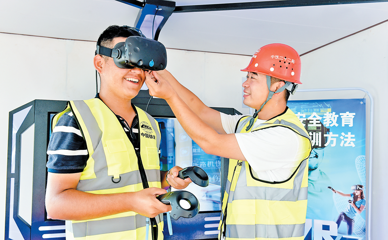 中国义乌网9月11日讯(义乌商报记者 盛庆乐)9月9日,记者在金义东市域轨道交通15标段施工现场看到,中铁二十二局的施工人员正在“VR虚拟现实安全体验馆”里,体验3D虚拟现实施工环境。