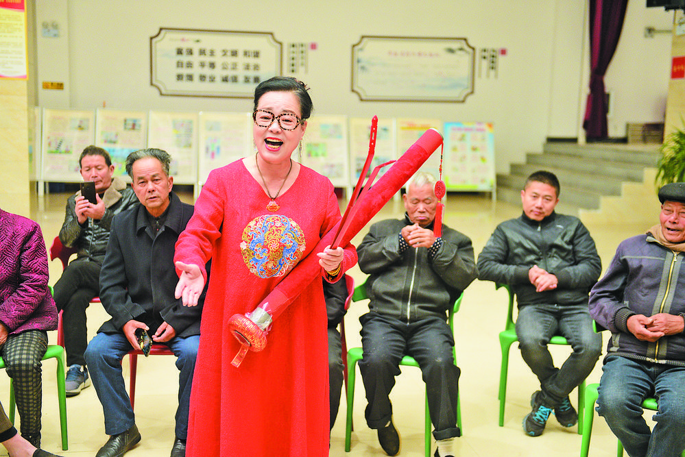 中国义乌网11月26日讯(义乌商报记者 龚盈盈)11月23日,在福田街道九如堂村文化礼堂,市曲艺家协会副主席宁铁英通过道情说唱,向村民们宣传民法典知识,村民围坐在她的身旁,听得十分认真。