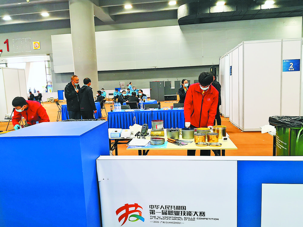 周森孩(右边穿红衣者)在广州参加全国首届职业技能大赛。