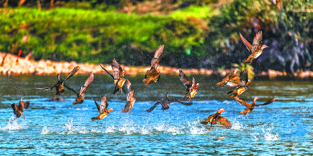 每到秋季,成群的鸳鸯就开始在南江湿地公园嬉戏,有的在水里追逐觅食,有的在岸边打盹休息。一阵微风拂过,惊起几只飞鸟,扑簌簌掠过低空,迅速融入周围山水之中。近年来,义乌湿地资源得到有效保护,在这里生活和越冬的野生动物逐年增加。