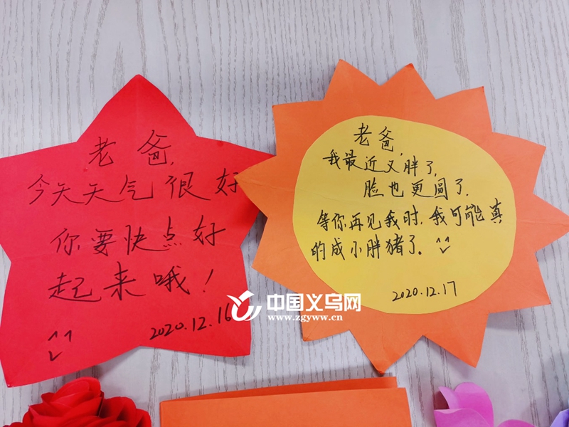 每天,浙大四院急诊监护室护士会把这些礼物传递给老人,把卡片上的话一字一句地念给老人听。像是有感应一般,慢慢地,老人清醒了过来,逐渐恢复了意识,甚至开始积极遵从医嘱,一边肢体活动也慢慢好起来了,能抬右手的时候,他就会把女儿送的手工花握在手里。将近20天的坚持,老人终于脱机了。