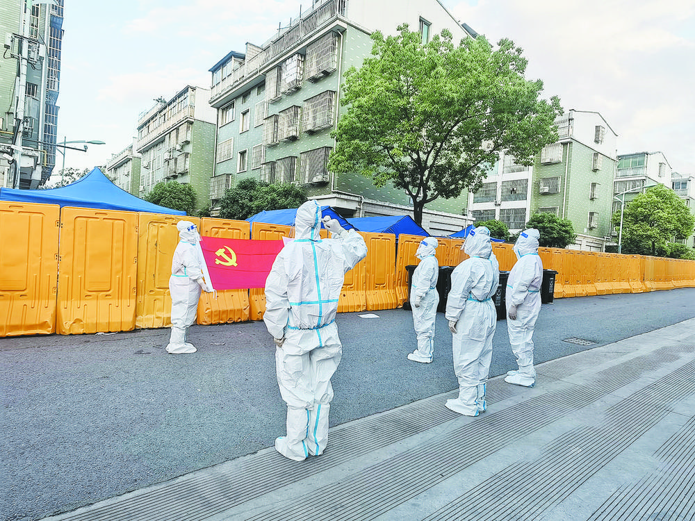 “我志愿加入中国共产党,拥护党的纲领,遵守党的章程……”4月23日下午4:30,一句句铿锵有力的誓词回响在江东街道青岩刘封控区内。5时许,其中的3名党员就奔赴提货点就位,准备给60余名滞留人员分发晚餐。