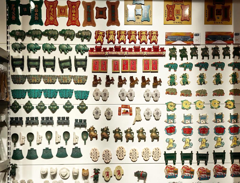 河南省安阳市殷墟宫殿宗庙遗址文创店内陈列的各式各样的冰箱贴。新华社记者冯松龄摄