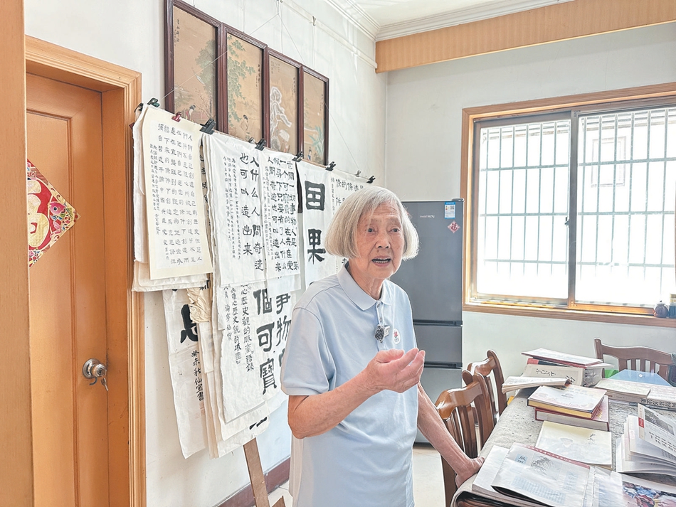 临近正午,李仙宝收拾好书桌,将当天写的书法作品小心翼翼地挂在墙上。“我要去老年助餐那里打饭了。”这位“宝藏奶奶”拿上袋子,利索地走下楼梯。在阳光的照耀下,老人矍铄的身姿散发着幸福的光芒。