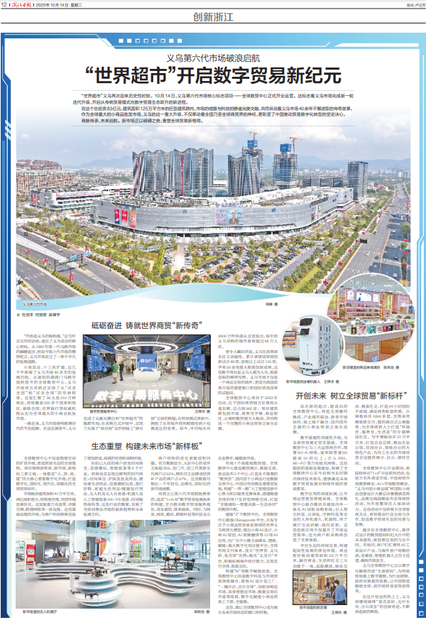 “世界超市”义乌再次迎来历史性时刻。10月14日,义乌第六代市场核心标志项目——全球数贸中心正式开业运营。这标志着义乌市场完成新一轮迭代升级,开启从传统贸易模式向数字贸易生态跃升的新进程。