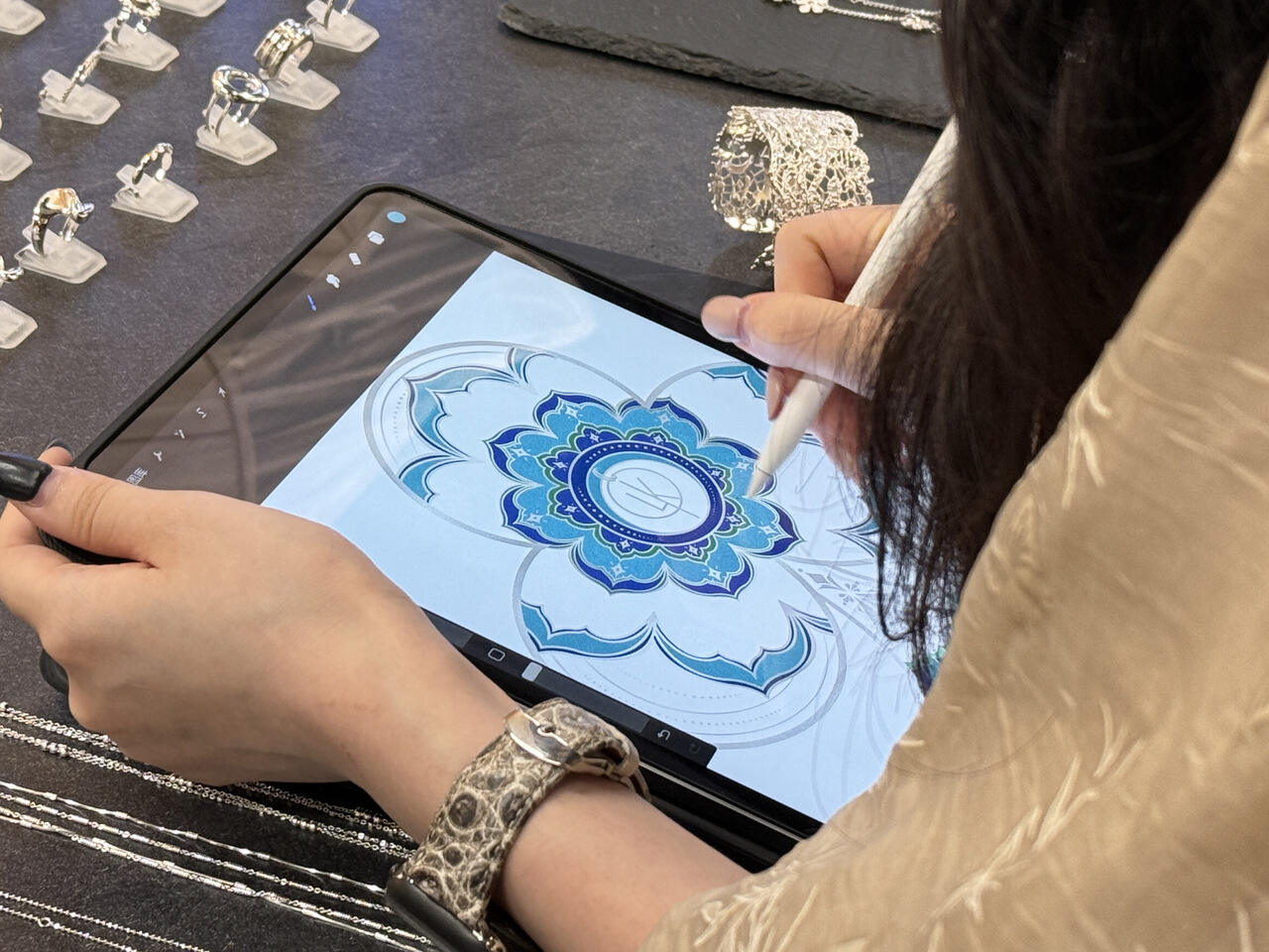 除了在新店内银饰品、毛衣链等上百个品类的珠宝饰品,在新店内核心位置,他放置了一个交互式的PAD终端。“顾客进来后,可以登录我们的平台,根据自身需求用AI工具自由设计款式,换颜色、换元素、换面料都可以。”黄子轩说,只要材料和工艺允许,公司就能定制出来。这套相对成熟的AI系统,既可以精准对接到顾客的个性化需求,也能降低公司的运营成本。