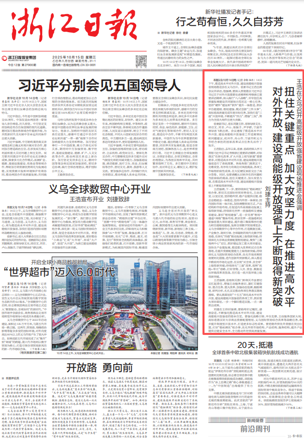 王浩强调,下一步,要持续深化“稳拓调优”组合拳,密切关注国际经贸形势变化,主动求变、以变应变,坚持稳外贸、稳产业链供应链、稳企业稳就业一体推进,坚持内外贸一体谋划、国内国际市场一体开拓,加快调整贸易方式、产品结构和市场布局,在促进内外高效联动发展上取得新突破;持续深化世界一流强港和交通强省建设,紧扣“枢纽建强”,进一步完善“枢纽+通道+网络”整体布局,抓好世界一流强港和民航强省重大项目建设,提升港口集装箱吞吐能力和空港枢纽能级,发挥全球数字贸易博览会、义乌全球数贸中心等平台作用,打造数据互联、产业聚合、规则引领、全球辐射的现代化数字贸易港,在深化“四港”联动发展上取得新突破;持续深化大宗商品资源配置枢纽建设,聚焦“三基地两中心”定位,抓好储运加工重大项目建设,加快全产业链发展,推进重大改革和试点任务落地,在提升资源配置能力上取得新突破;持续深化义乌国际贸易综合改革,优化市场采购贸易便利化措施,迭代创新外贸新模式,深入推进中欧班列市场化运营,在实现“买全球、卖全球”上取得新突破;持续深化“三最”改革,按照“流程+单元”思路,打好货物、人员、资金、数据进出环境改革攻坚战,在打造一流开放环境上取得新突破。