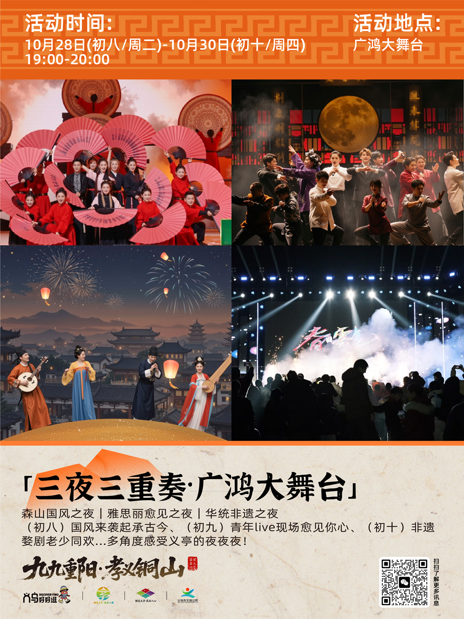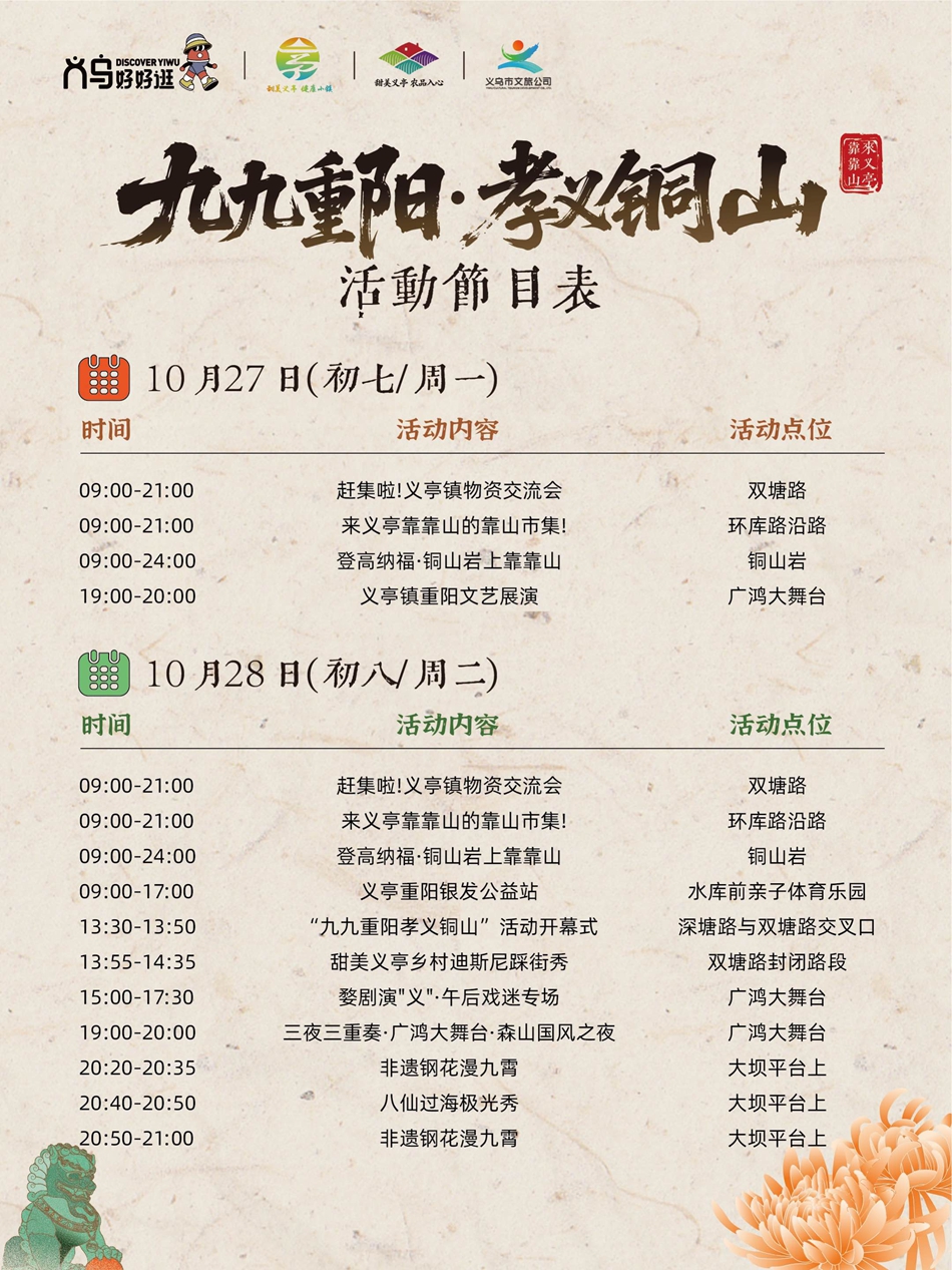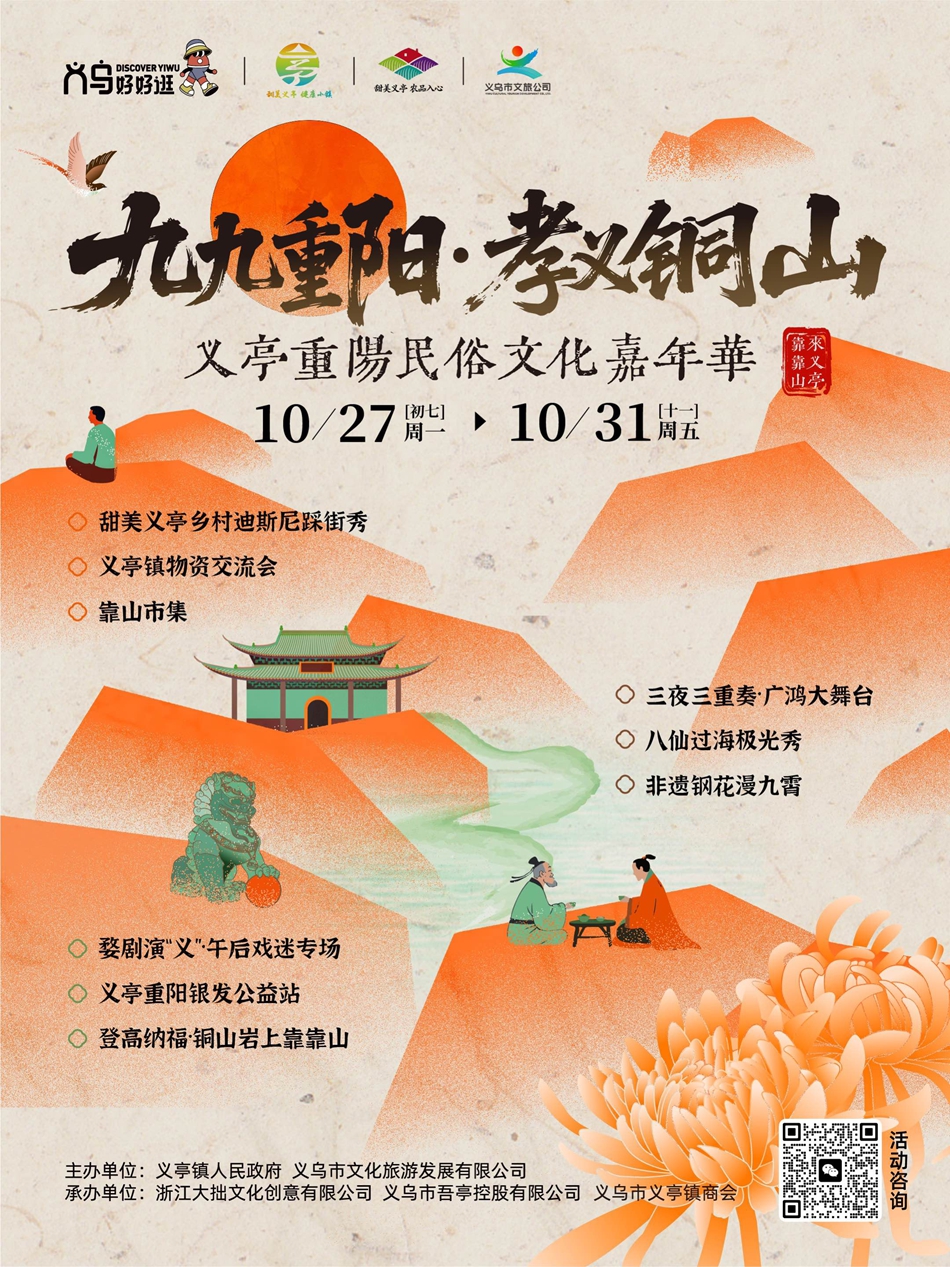 中国义乌网10月23日讯(记者 陈佳琪 编辑 童荟颖)时序更迭,又临重阳。“九九重阳”传统佳节渐近,在义乌义亭镇的铜山岩下,一场新潮活力的文旅盛宴正悄然酝酿。记者从义亭镇获悉,紧扣义乌全域文旅IP“义乌好好逛”,挖掘“甜美义亭”精神内涵的“义乌好好逛・九九重阳孝义铜山”系列活动,将于10月27日至10月31日在铜山岩及周边区域热闹开启,从白天到夜晚,从民俗体验到时髦的系列活动,邀市民游客共赴重阳之约。