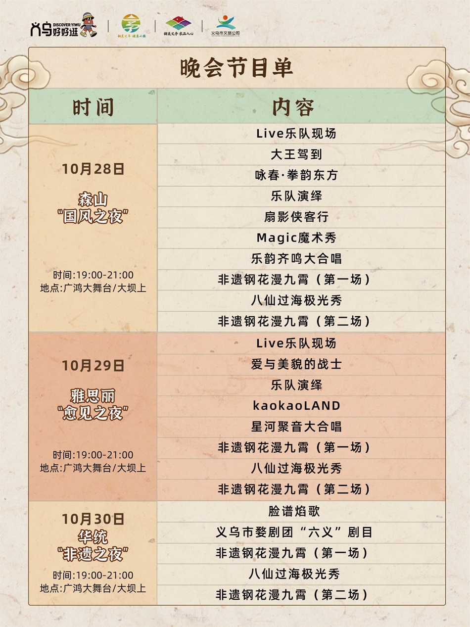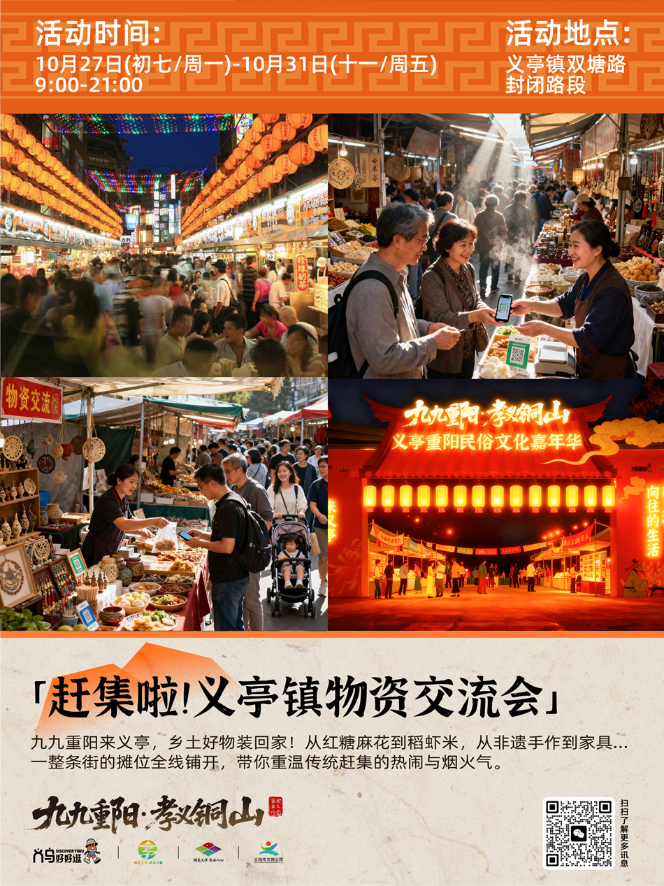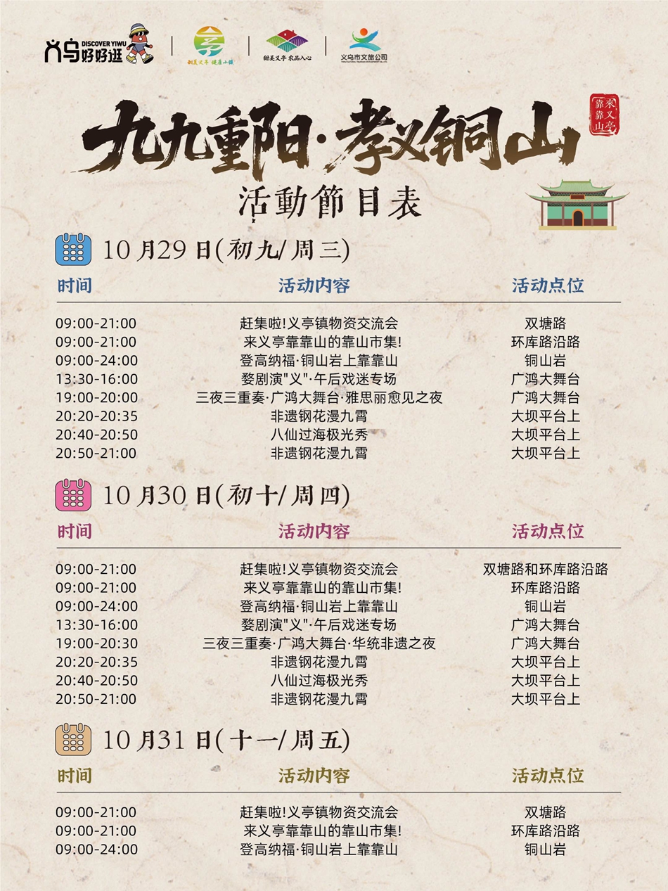 中国义乌网10月23日讯(记者 陈佳琪 编辑 童荟颖)时序更迭,又临重阳。“九九重阳”传统佳节渐近,在义乌义亭镇的铜山岩下,一场新潮活力的文旅盛宴正悄然酝酿。记者从义亭镇获悉,紧扣义乌全域文旅IP“义乌好好逛”,挖掘“甜美义亭”精神内涵的“义乌好好逛・九九重阳孝义铜山”系列活动,将于10月27日至10月31日在铜山岩及周边区域热闹开启,从白天到夜晚,从民俗体验到时髦的系列活动,邀市民游客共赴重阳之约。