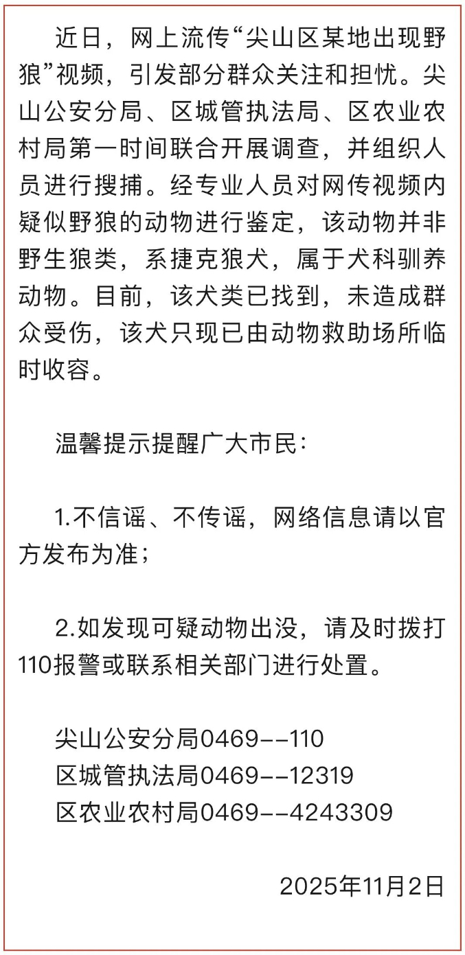 11月2日,黑龙江省双鸭山市尖山区人民政府办公室微信公众号发布消息称,近日,网上流传“尖山区某地出现野狼”视频,引发部分群众关注和担忧。尖山公安分局、区城管执法局、区农业农村局第一时间联合开展调查,并组织人员进行搜捕。