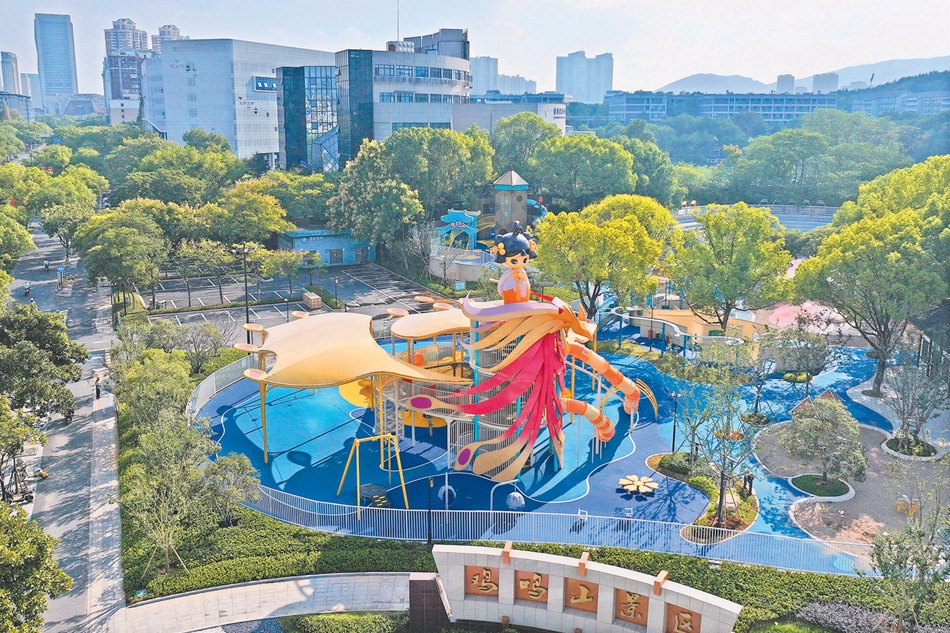 11月5日,义乌鸡鸣山公园主入口处,一组新建成的“小凤鸣驾到”造型吸引市民关注。这是鸡鸣山景观及经营业态整体提升工程中已完成的代表性景观之一。
