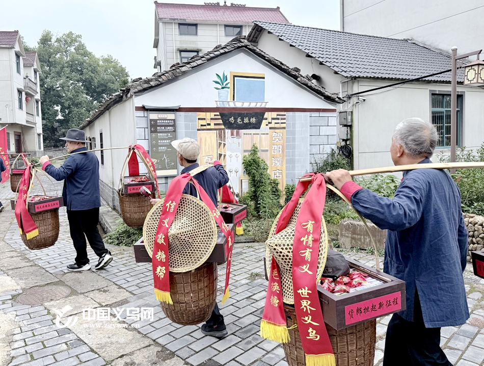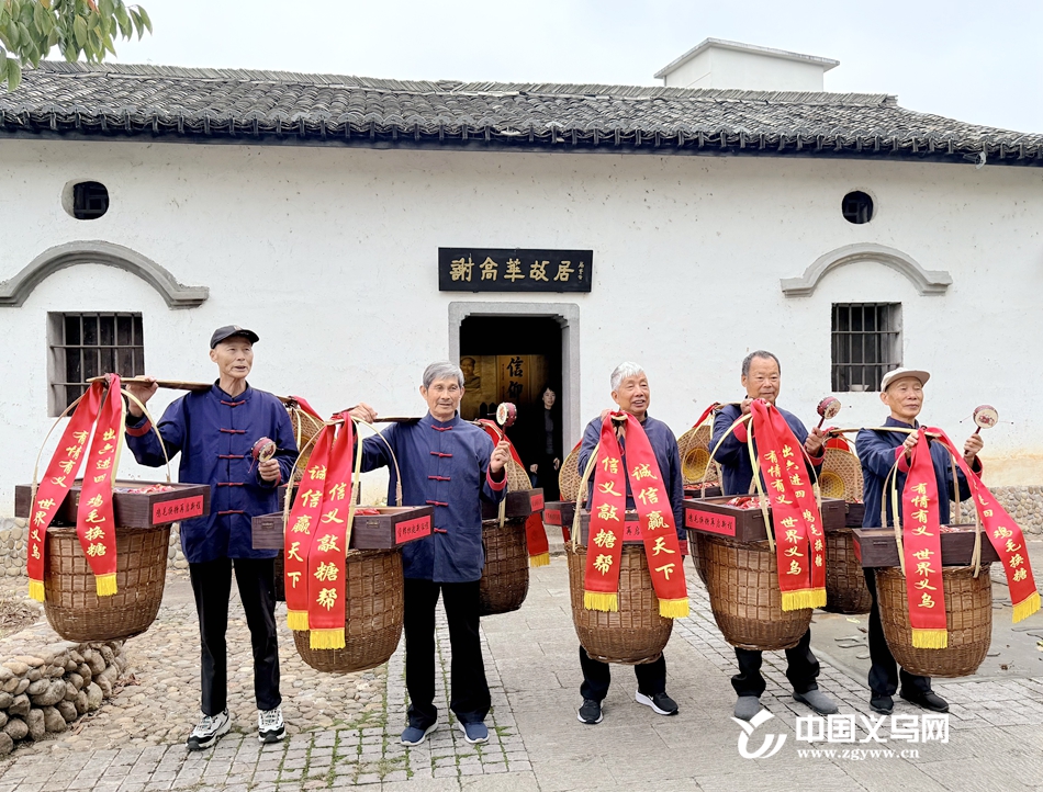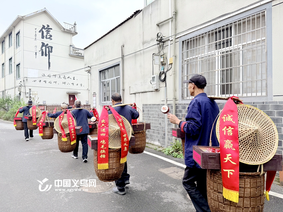 在龙游大南门历史文化街区,货郎担上结挂的“有情有义,世界义乌”“信义敲糖帮”“诚信赢天下”红色条幅格外显眼。今年已经80岁的“老货郎”陈有明挑起担子依然精神抖擞。“我让我的儿子、孙子都来参加这次有意义的活动,17年的鸡毛换糖经历了酸甜苦辣。”陈友明说,“希望他们在做企业、接事业的过程中千万不要忘了创业的艰辛。”