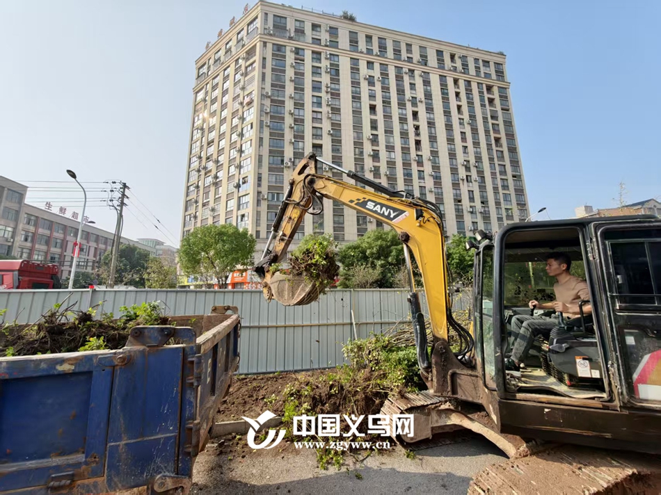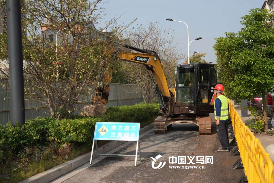 中国义乌网11月14日讯(记者 陈佳琪 编辑 童晓)11月14日上午,义乌市上溪镇金塘路拓宽改造工程正式开工。在金塘路与上城路路口施工现场,一侧辅道及绿化带被锥桶和挡板隔离,挖掘机在有序清理绿化带,工人们手拿铁铲等工具忙忙碌碌……整个施工现场一派热火朝天的景象。
