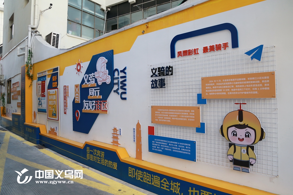 义骑同行友好街区位于稠城街道,义乌市市场监管局牵头成立义乌市网约配送员行业综合党委,联合义乌市民营经济发展联合会成立义乌市网约配送员工作委员会,建成义乌市外卖骑手党群服务中心,成立外卖骑手流动党员党支部,打造“在义骑向未来”党建双向服务品牌,整合辖区餐饮、生活、医药等146家爱心商户成立护“骑”联盟。创新推出“骑手共治”机制,让外卖骑手从城市“低头过客”转变为社区治理的见证者与参与者。