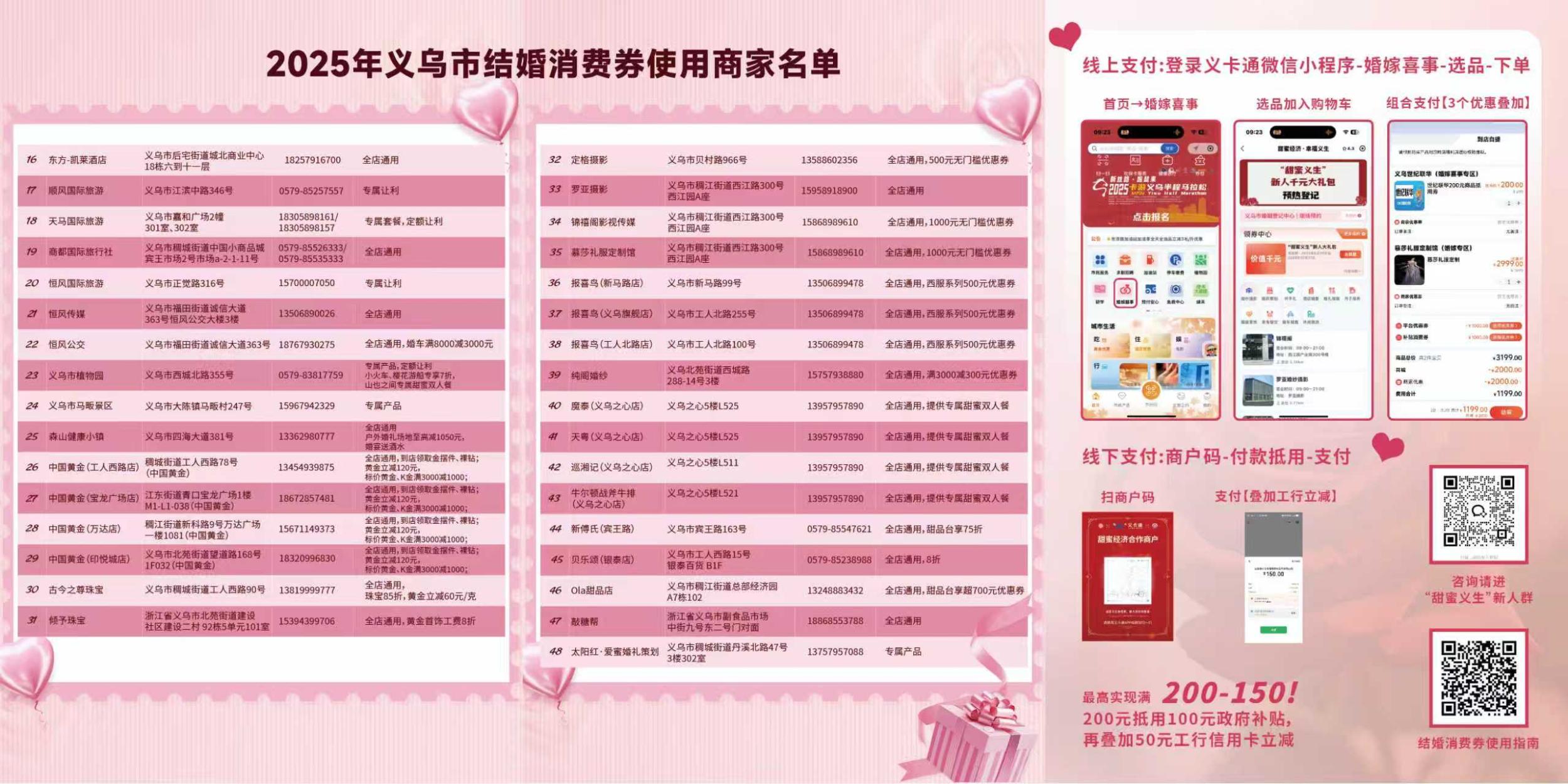 另外,消费券依托“义卡通”微信小程序实现领券、核销“一站式”管理,目前支持线上支付线下使用,新增线下扫商户码核销功能,适配不同消费需求。首批35家及第二批13家合作商家已全部上线,覆盖婚嫁全产业链,新人可通过“义卡通”微信小程序查询具体商家名单。