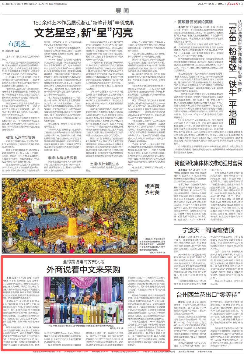 展会的国际吸引力从阿塞拜疆客商穆拉德身上可见一斑。他在国外社交平台上拥有14.5万粉丝,常分享在中国的采购经历。“我们在义乌设有外贸公司,通过阿里巴巴国际站获客成效显著。这次来,既想交流行业经验,也希望能对接更多优质供应链。”一口流利的中文让他与供应商的沟通毫无障碍。走在展会现场,记者经常会遇到像穆拉德这样说中文来采购的外商。他们中有些是常驻义乌的“中国通”,有些是读大学时学习中文专业的外商。