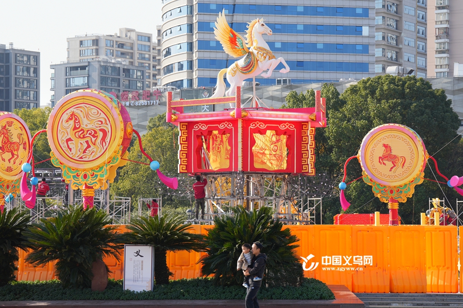 作为灯会核心,绣湖广场中心的《马耀华章潮起新春》主灯组已初具雏形。“主景是高15米的走马灯,上方白色的飞马振翅欲飞,象征义乌人民‘一马当先’的开拓精神。”义乌市建设局园林绿化处相关负责人介绍。