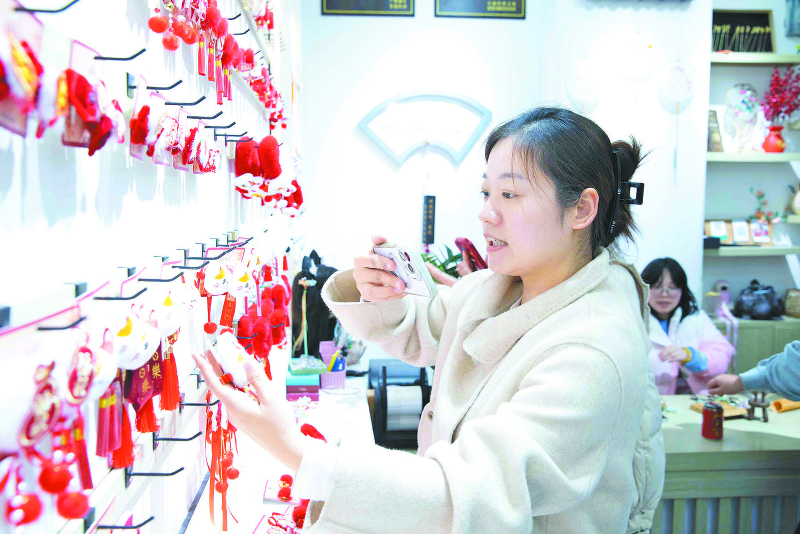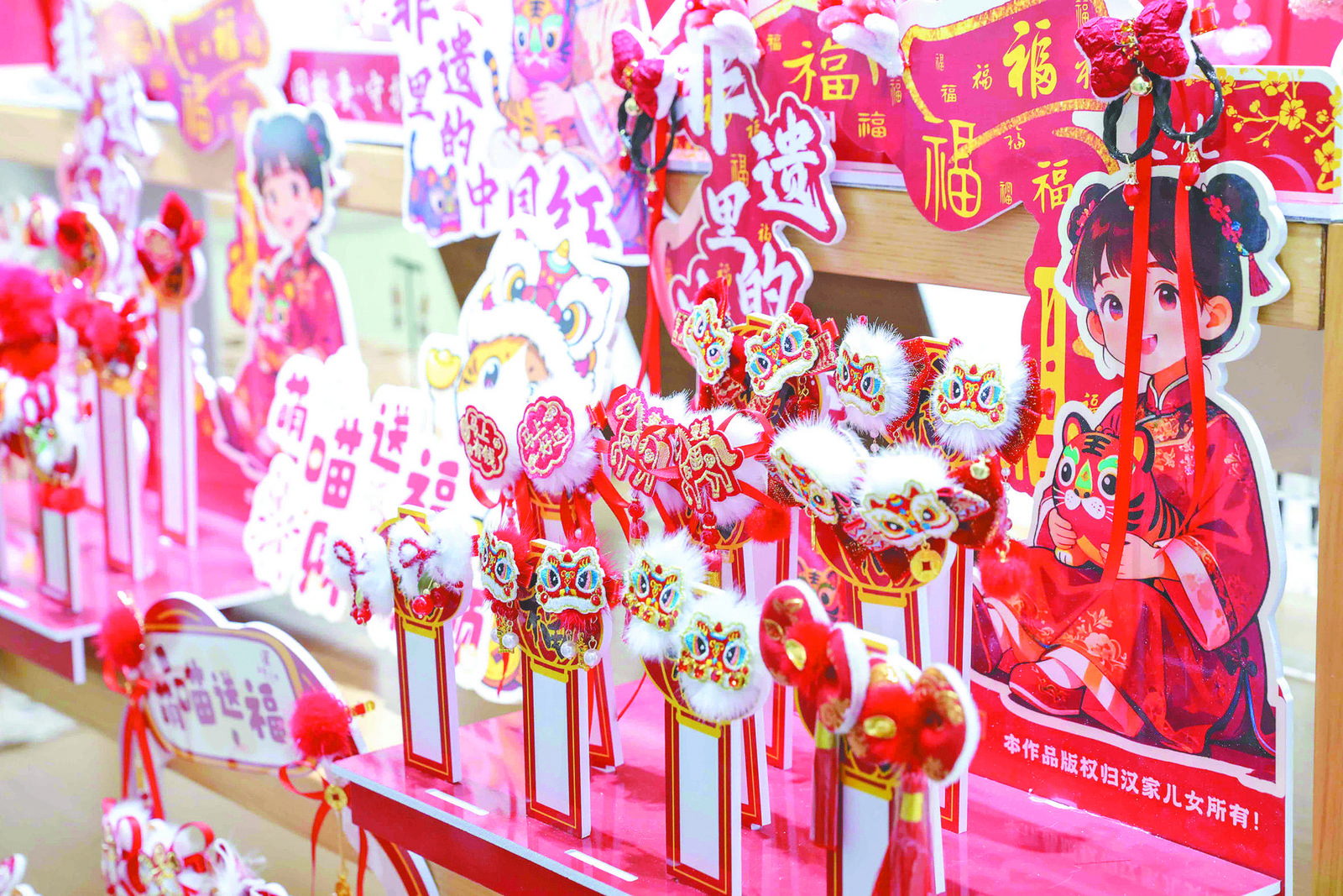 祈年文化节庆用品商铺也“潮”味十足。店内,满墙的红包、扇花、中国结洋溢着扑面而来的喜气。