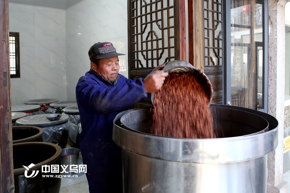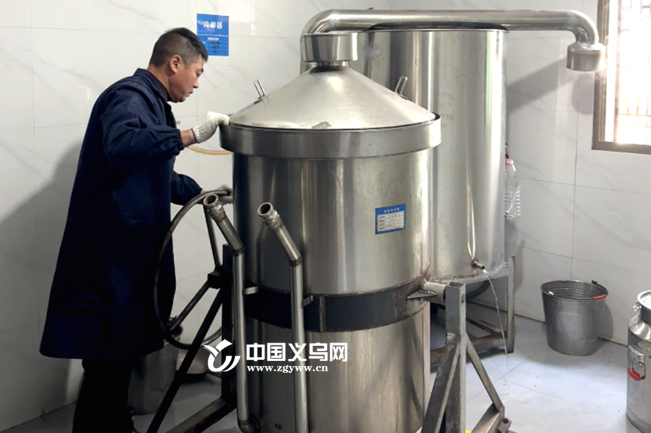 中国义乌网12月15日讯(记者 龚书弘 编辑 刘蓉) 蒸煮高粱、摊凉拌曲、下缸发酵、上甑蒸馏……12月15日清晨,义乌市赤岸镇尚阳村共富酒坊发酵间内,经过系列规范工序的“尚阳白酒”进入最终酿酒阶段。从一粒种子到一滴美酒,“尚阳白酒”这个百年老字号从曾经的“酒香无人识”,如今已成功转型升级成为带动村民增收、激活乡村经济的“共富密码”。