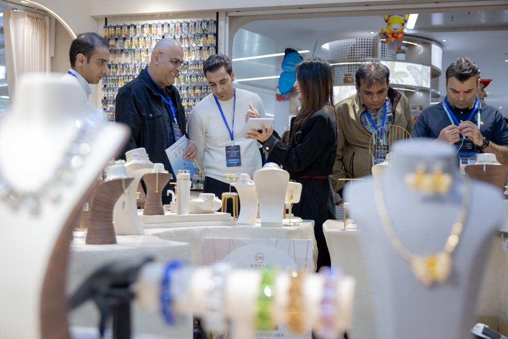 2025年10月27日,外国商人在浙江义乌第六代市场全球数贸中心进行采购洽谈。(吴峰宇摄)