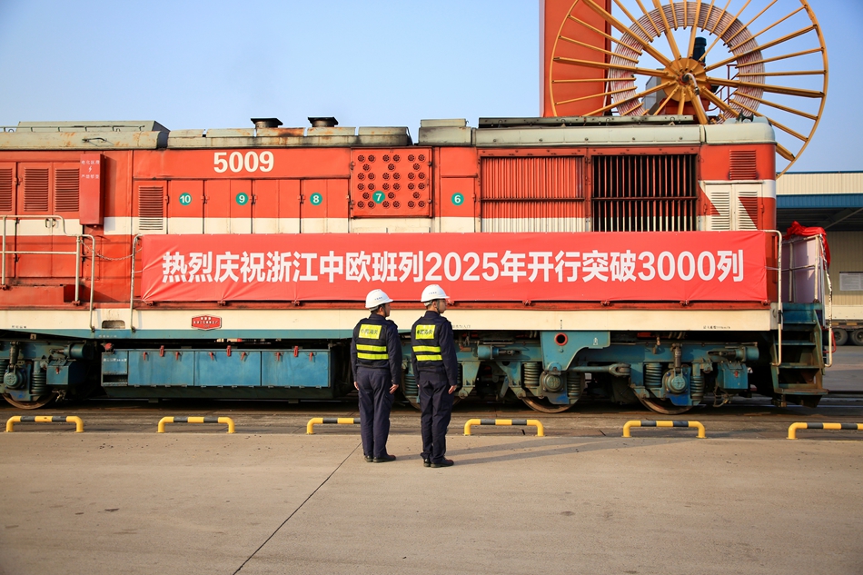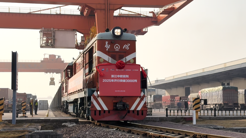 中国义乌网12月30日讯(记者 龚书弘 通讯员 刘明明 编辑 童荟颖)12月30日,一列满载100标箱光伏组件、汽车配件、五金工具、机械设备的X9216次中欧班列经海关监管鸣笛驶出,经新疆霍尔果斯口岸出境,奔赴中亚五国。这趟班列的开行,标志着浙江中欧班列(义新欧)2025年开行量正式突破3000列(折算列)大关,同比增长14.8%,班列开行核心指标均创历史新高。