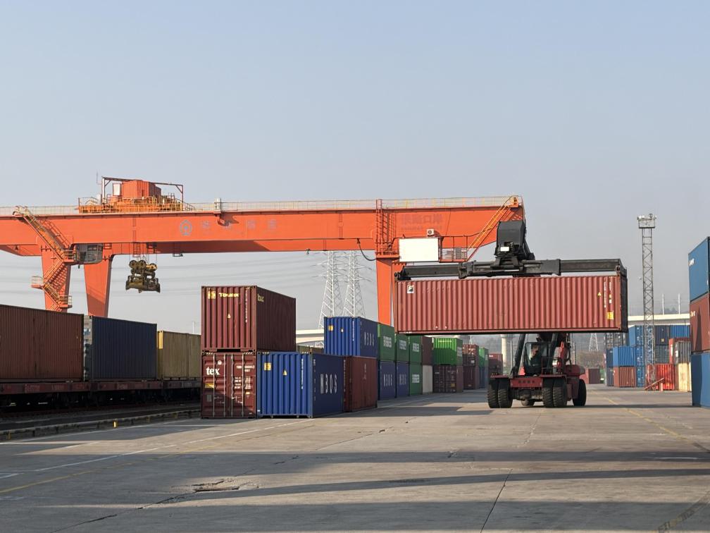 图为浙江义乌西铁路货场内,正面起重机在搬运码放集装箱。新华社记者魏一骏 摄