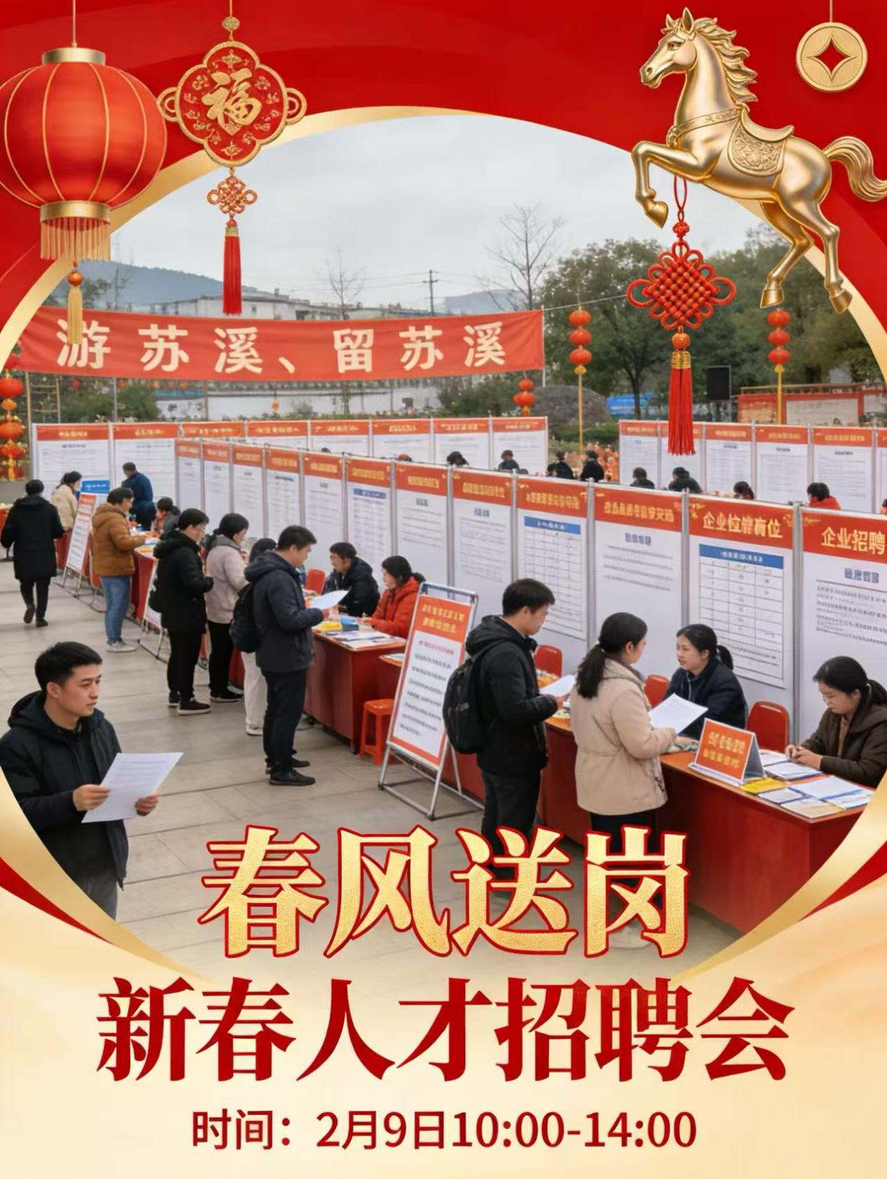 我们邀您游苏溪、留苏溪。春节前后是人才返乡团聚的高峰期,也是企业招贤纳士的黄金窗口。本次活动专门搭建供需对接平台,组织镇内重点企业、优质用人单位现场设展,提供涵盖普工、技工、管理、服务等多类型岗位。企业现场招聘、现场面试,为您解答就业、创业等各类问题。