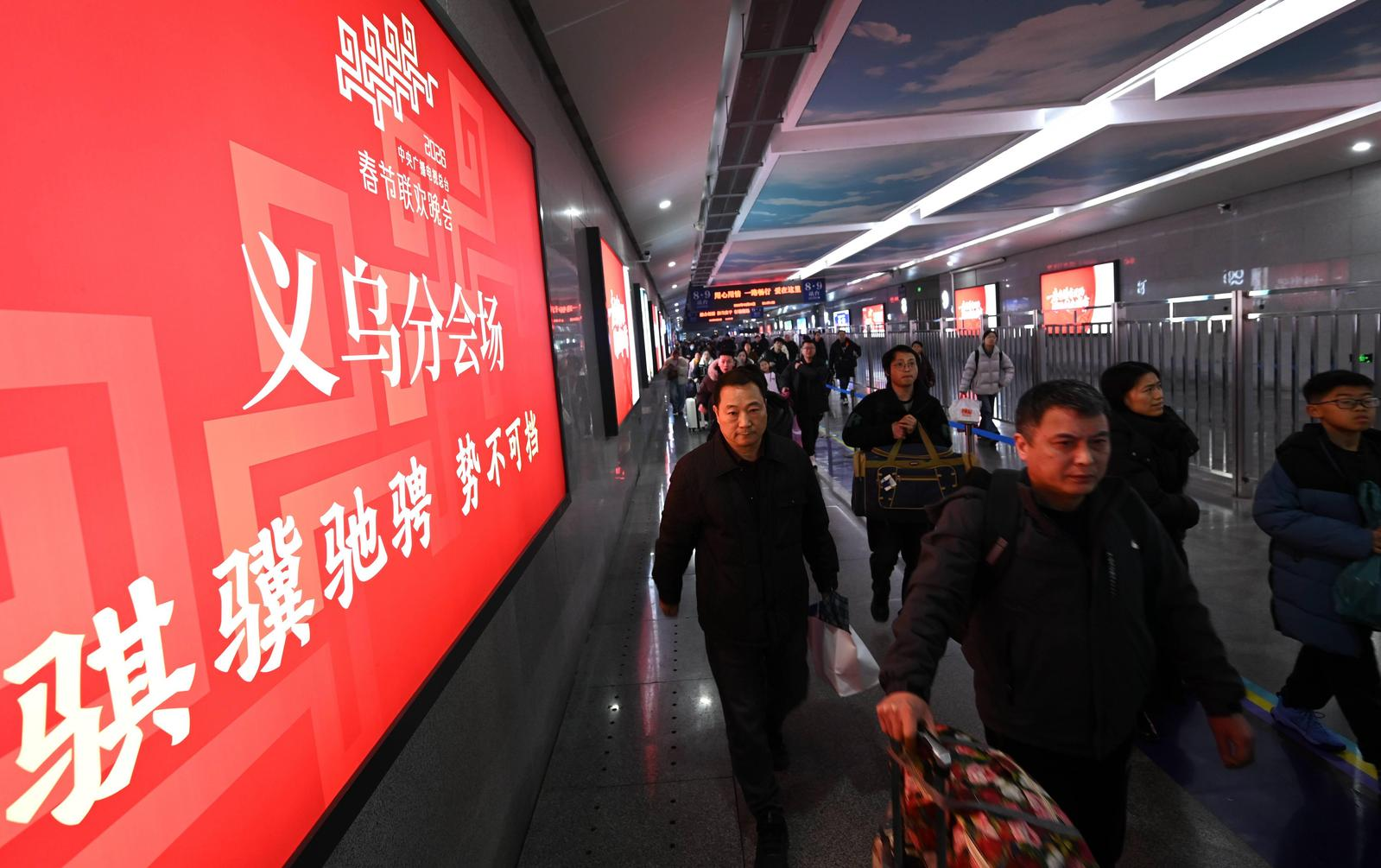 今年义乌成为总台春晚分会场,整座城市也沉浸在喜庆的“春晚氛围”中。自2月15日起,我市开通“跟着春晚游世界义乌”暖心专线,带旅客感受义乌浓厚的商贸活力与文旅风情。此外,铁路义乌站和义乌机场内均设有总台文创快闪店,展示义乌本土商户的特色产品;铁路义乌站地下通道的显示屏上,“骐骥驰骋势不可挡”的总台春晚义乌分会场海报,为匆匆归途注入春晚的热情与喜庆。