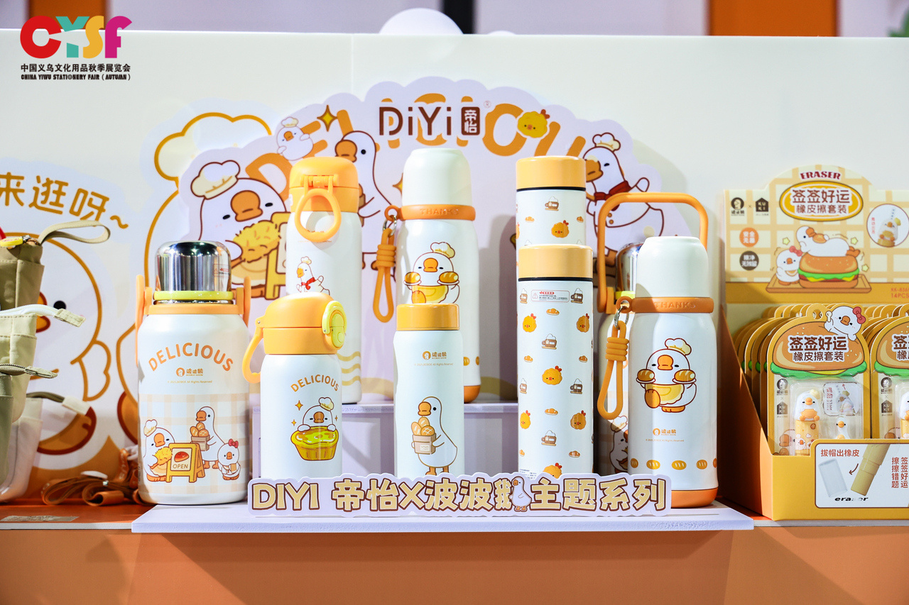 2023年,义乌市文化用品行业协会以义乌诗人骆宾王的《咏鹅》为设计灵感,打造了系列IP核心形象“波波鹅”。这只头顶爱心、扁眼灵动的卡通鹅,凭借萌趣设计火爆出圈,不仅化身中性笔、书包等文具,更通过“IP共享模式”免费开放给200家会员企业使用。“一枚普通文具盒批发价在1到2元,融入‘波波鹅’元素后,单价会升至15至18元。”黄昌潮说,目前相关IP产品远销中东、欧美等地,并与泰国等地签订了IP授权推广的战略合作协议。