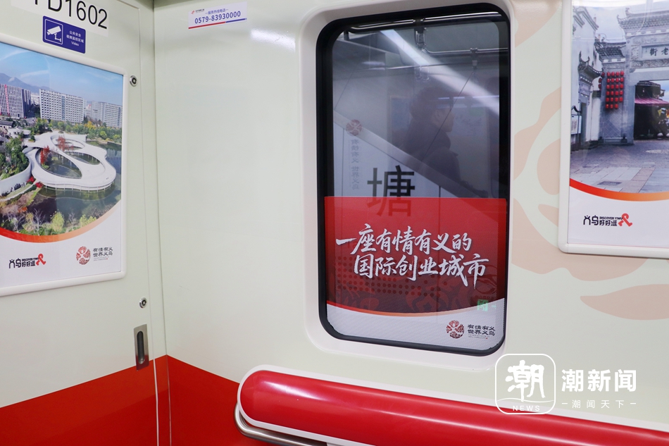 记者在现场看到,专列车身以红黄为主色调,醒目印着“有情有义世界义乌”城市文化品牌标识,以及“一座有情有义的国际创业城市”口号。步入列车内部,浓郁的义乌风情瞬间包裹感官,整节车厢化身为一座流动的城市文化展厅,通过图文展示等形式,全方位呈现了全球数贸中心、鸡鸣阁、分水塘村、双江湖新区、佛堂老街等义乌标志性地标,展现了城市的自然之美、人文之韵与发展之力。与此同时,“有情有义世界义乌”“义乌好好逛”等品牌标识巧妙点缀车厢各个角落,与窗外飞速掠过的城市景观交相辉映,形成一幅流动的城市画卷。