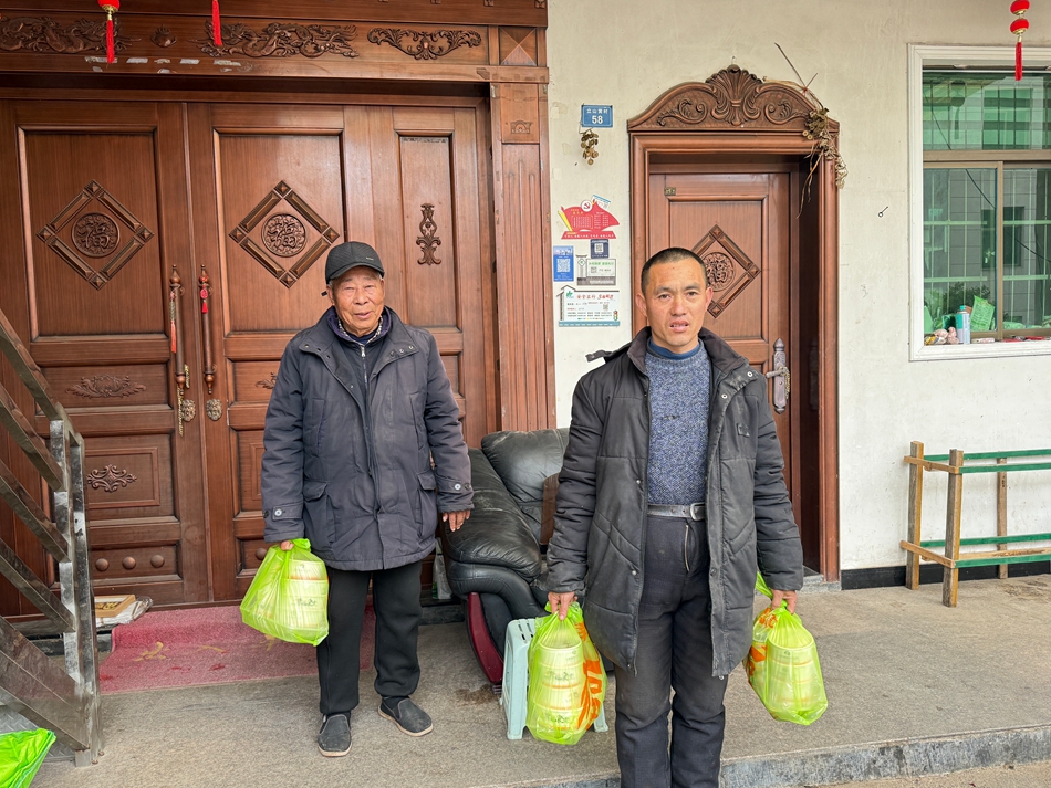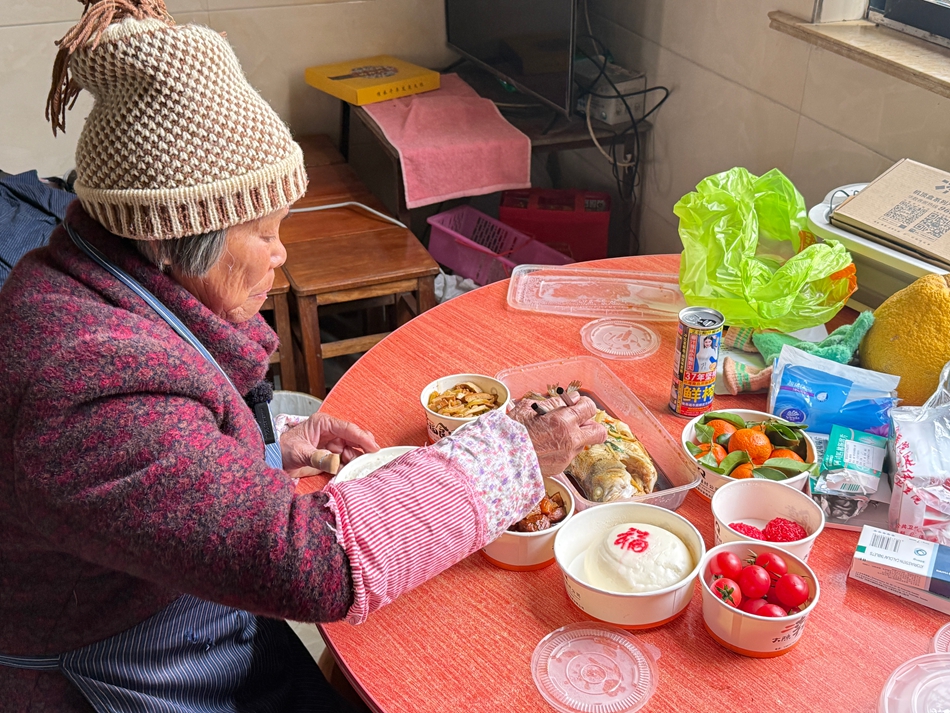 打开餐盒后,楼奶奶惊喜之余,向一旁的楼师傅问道,“过年你们也给我送(餐)吗?”在得到肯定答案后,这才满意地坐下用餐。