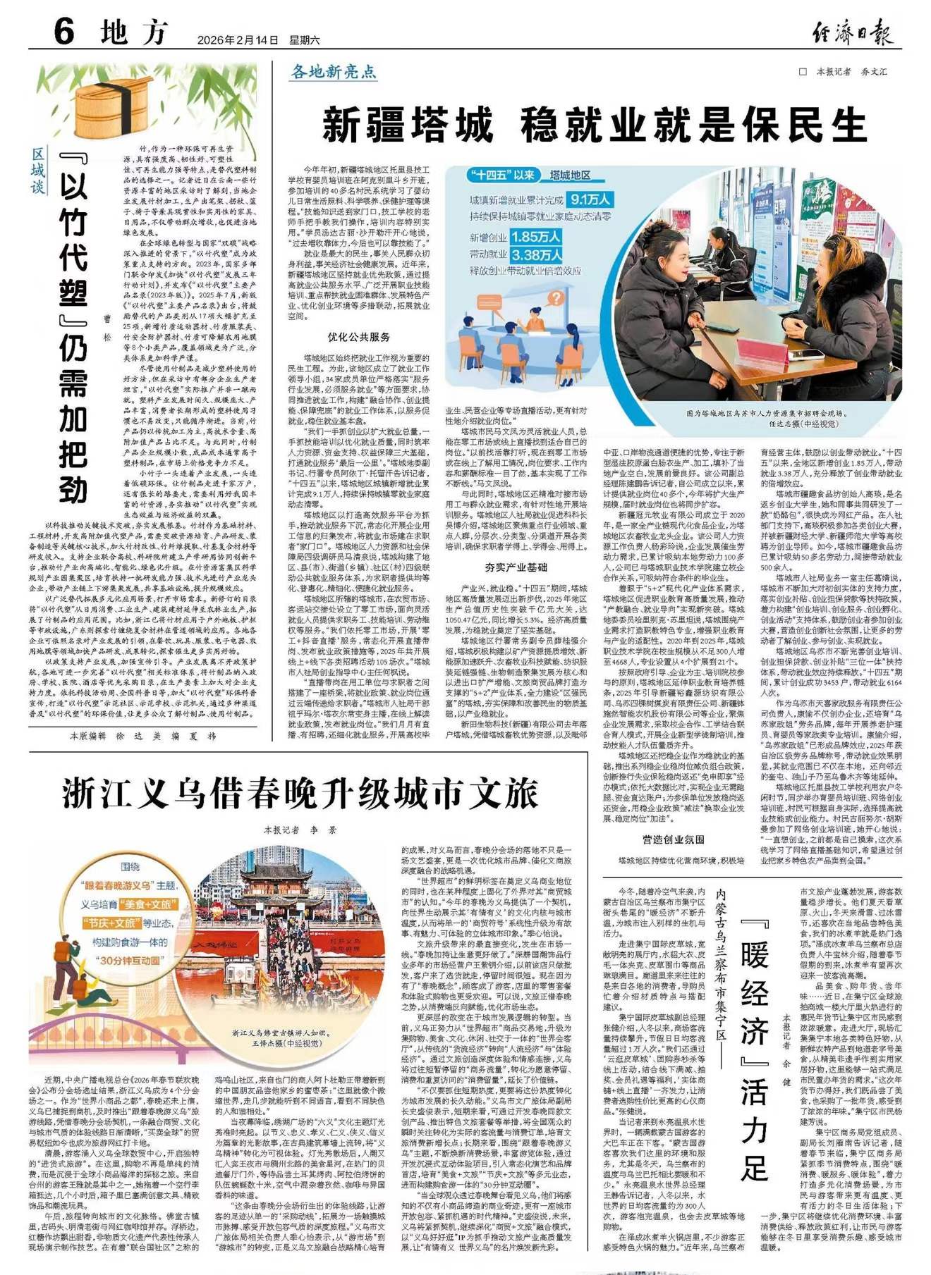 “这条由春晚分会场衍生出的体验线路,让游客的足迹从单一的‘采购动线’,拓展为一场触摸城市脉搏、感受开放包容气质的深度旅程。”义乌市文广旅体局相关负责人季心怡表示,从“游市场”到“游城市”的转变,正是义乌文旅融合战略精心培育的成果,对义乌而言,春晚分会场的落地不只是一场文艺盛宴,更是一次优化城市品牌、催化文商旅深度融合的战略机遇。