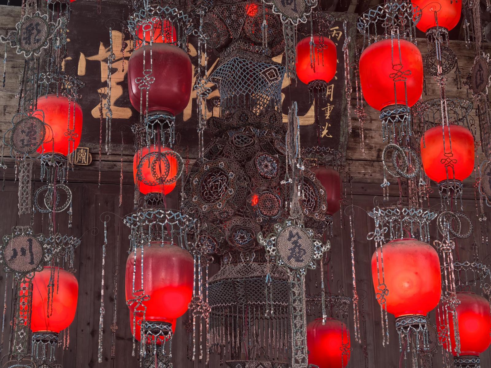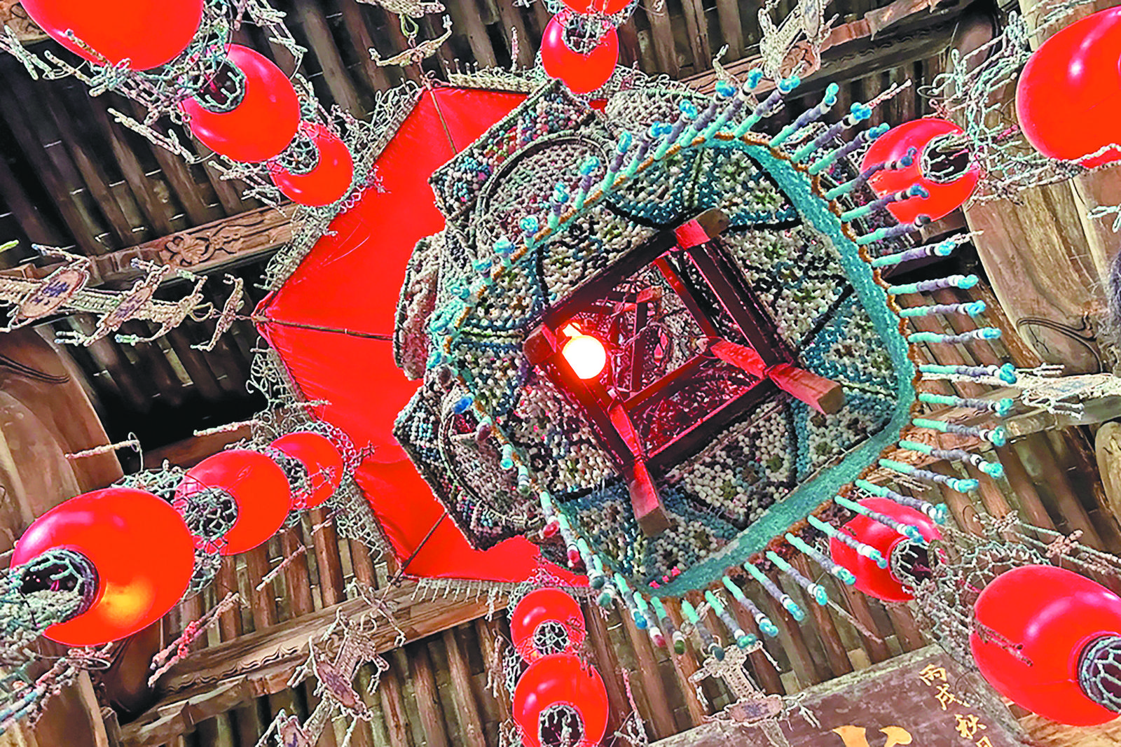 细细观赏,大珠灯中间串联着的三盏大灯称为“娘灯”,周围则串着六串半连的琉璃灯,寓意六六大顺、四季平安。六串珠子还分别用各色玻璃珠串成了诗联:“彩连川泽媚,何愁帘月尽,胜似宜春苑,还同不夜城,光射斗牛平,自有宝珠明”。这些诗句如天工巧作,映衬着红色灯光,照亮了整个厅堂,也照亮了古村的文化记忆。
