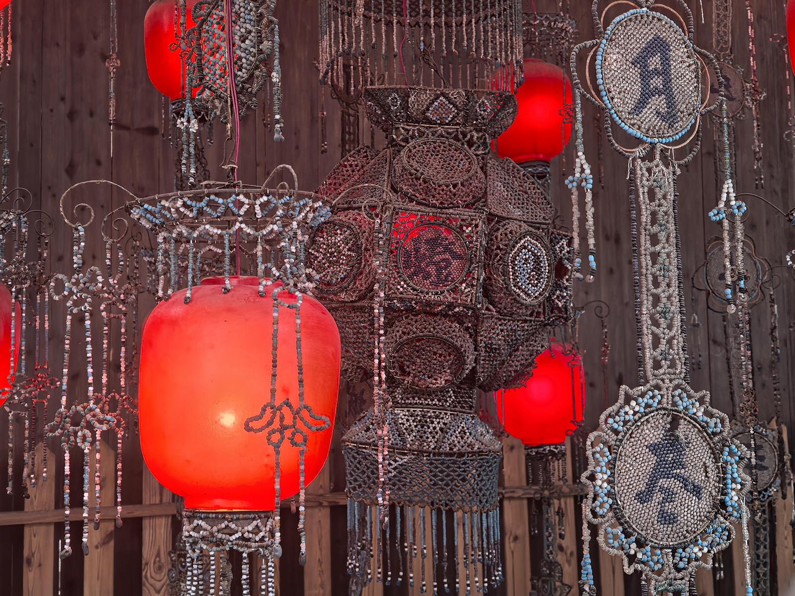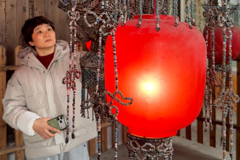 如今,细看珠灯的衔接处,依稀可见白色线头的修补痕迹,这些“新痕”也成为珠灯新时代的印记。灯罩从过去的红色琉璃换成红色塑料,烛火也换成了电灯,灯的主体依旧是那120多万颗玻璃珠串起的大灯。