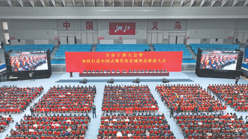 风好正是扬帆时,策马疾驰启新程;重任千钧再出发,奋蹄奔腾向未来。3月3日,全市干部大会暨加快打造中国式现代化县域典范推进大会召开。金华市委副书记、义乌市委书记叶帮锐在会上强调,要深入学习贯彻习近平总书记重要讲话重要指示批示精神,牢固树立和践行正确政绩观,深入践行“八八战略”,聚焦聚力落实习近平总书记“4+1”重要要求和省委“132”总体工作部署,按照全省新春第一会、金华市企业创新大会和市委十五届九次全体会议暨市委经济工作会议的部署要求,坚持和深化“义乌发展经验”,深入实施“146”发展战略,聚力打造“八个典范”,翻篇归零、走在前列,以实干实绩实效书写中国式现代化县域典范的壮阔篇章,为全国全省作出更大义乌贡献。