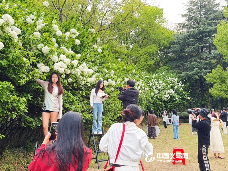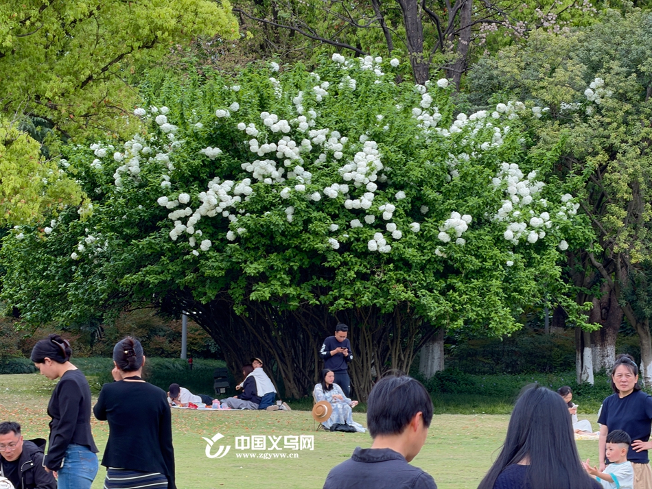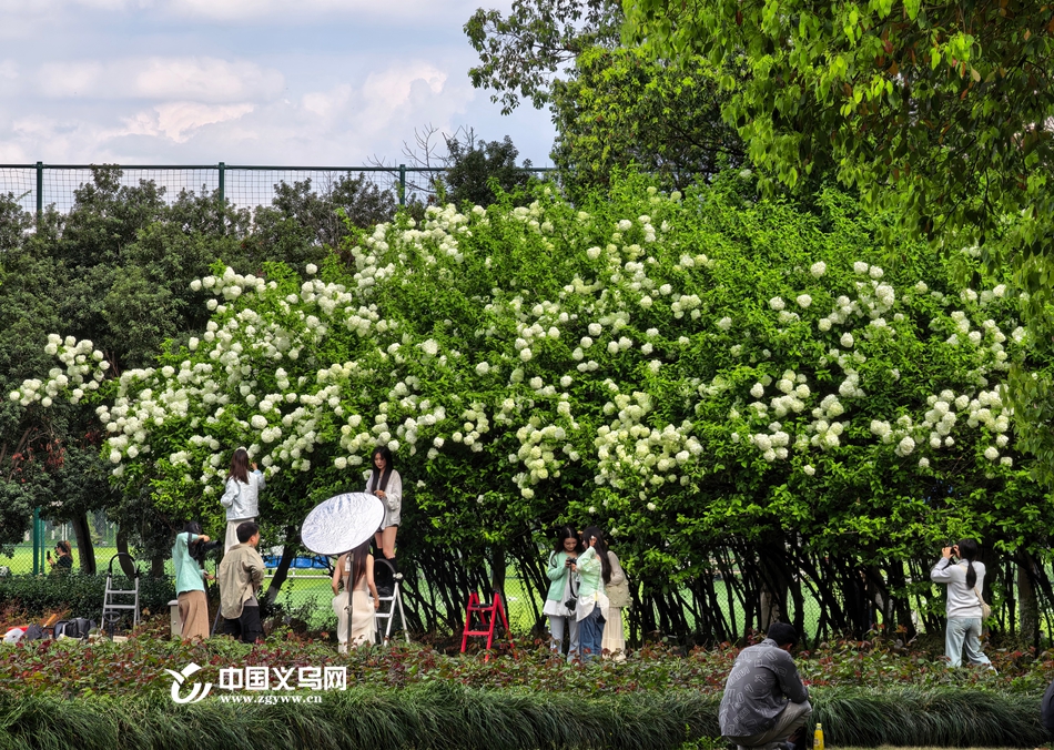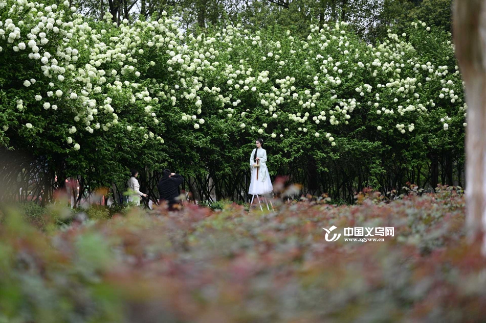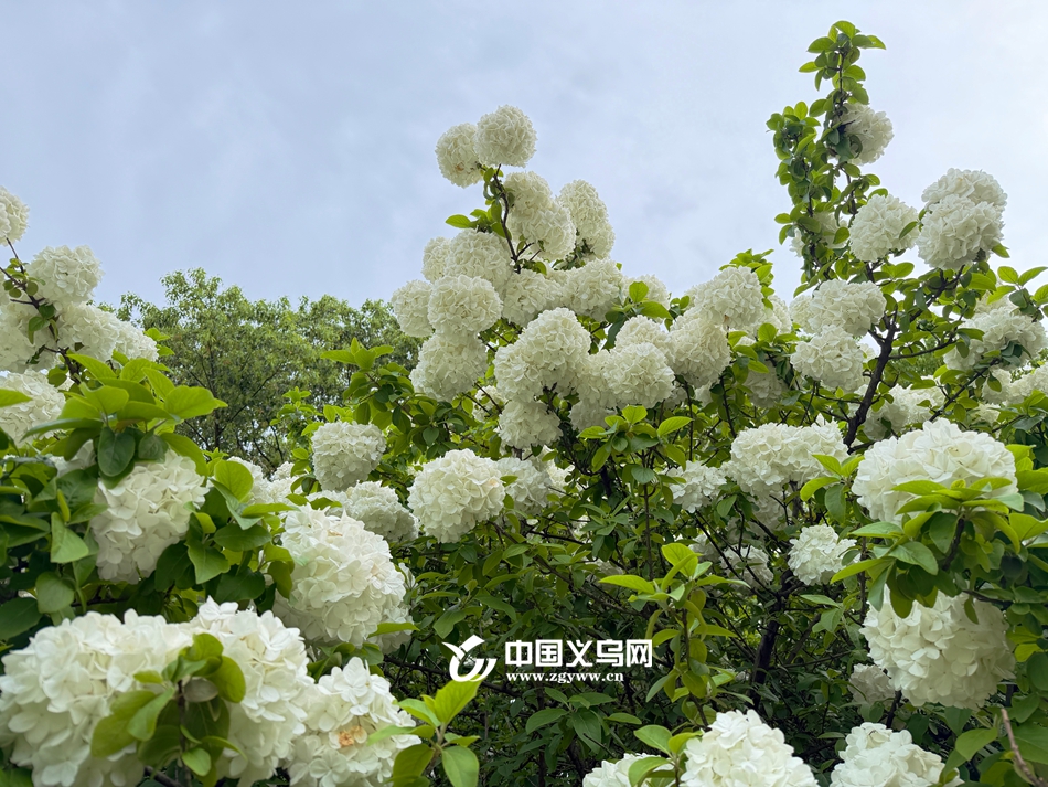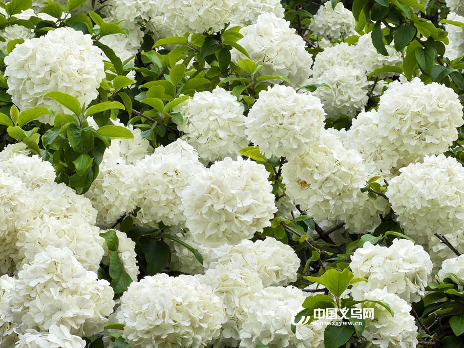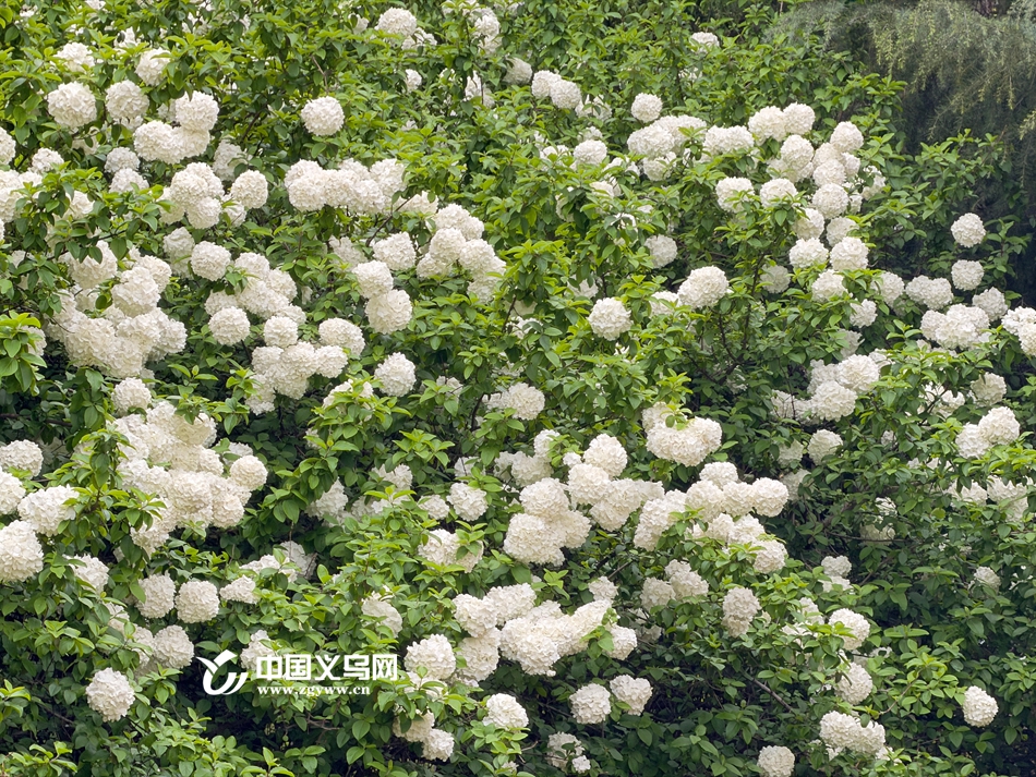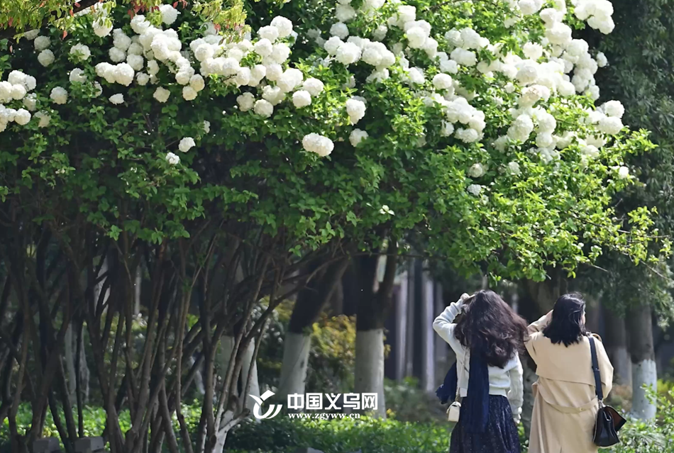 中国义乌网4月8日讯(记者 陈佳琪 车志蒙 编辑 童荟颖)暮春时节,花事正盛。近日,义乌江滨绿廊、绣湖公园等地的木绣球迎来最佳观赏期,团团白花如雪球压枝,清新雅致,成为市民春日打卡的新晋“顶流”。