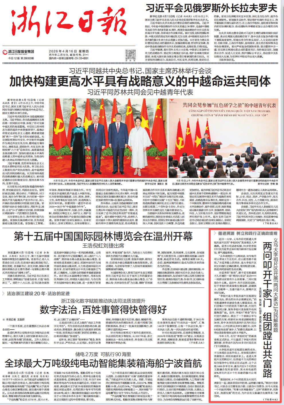 2026年4月16日《浙江日报》头版
