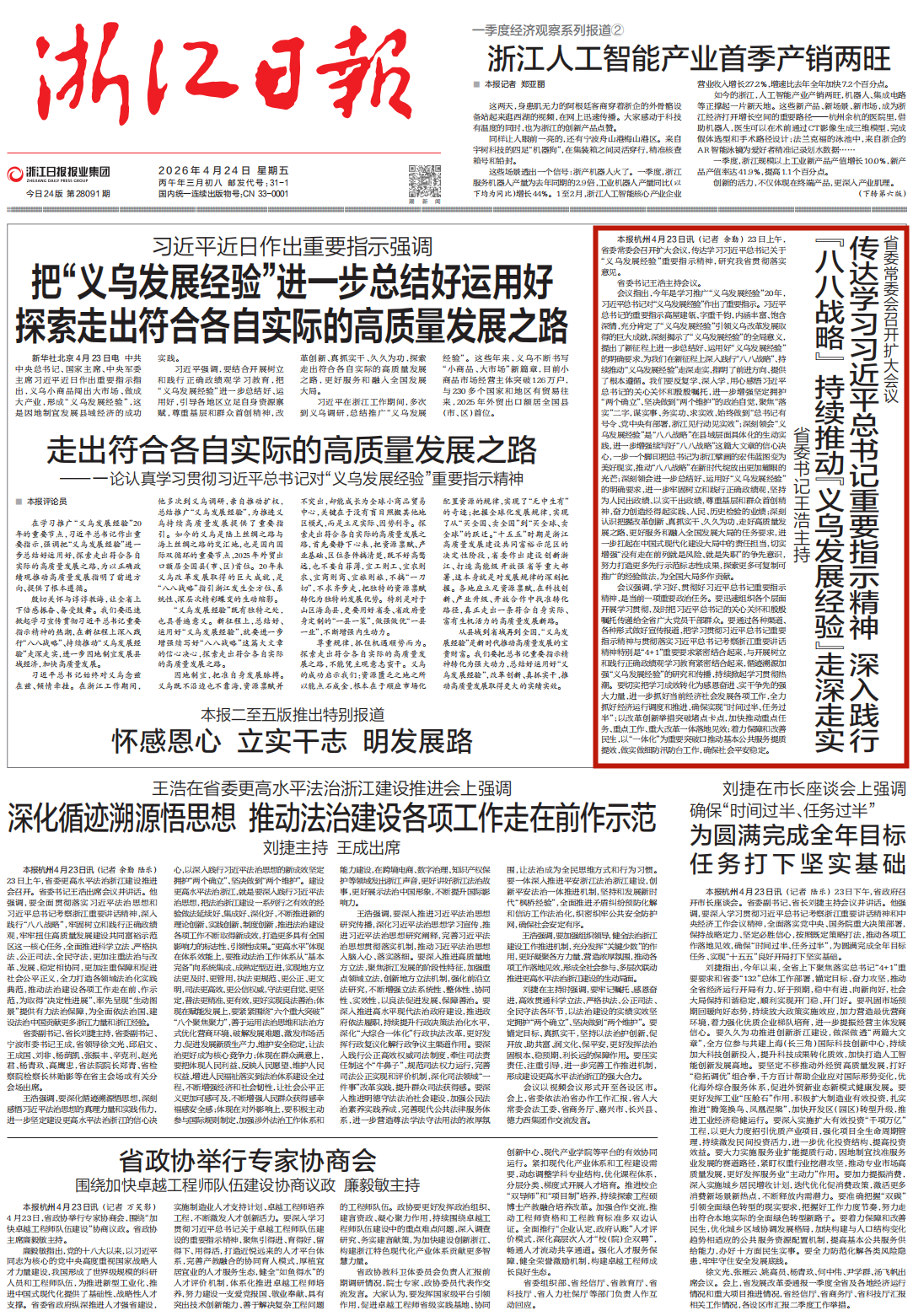 会议指出,今年是学习推广“义乌发展经验”20年,习近平总书记对“义乌发展经验”作出了重要指示。习近平总书记的重要指示高屋建瓴、字重千钧,内涵丰富、饱含深情,充分肯定了“义乌发展经验”引领义乌改革发展取得的巨大成就,深刻揭示了“义乌发展经验”的全局意义,提出了新征程上进一步总结好、运用好“义乌发展经验”的明确要求,为我们在新征程上深入践行“八八战略”、持续推动“义乌发展经验”走深走实,指明了前进方向、提供了根本遵循。我们要反复学、深入学,用心感悟习近平总书记的关心关怀和殷殷嘱托,进一步增强坚定拥护“两个确立”、坚决做到“两个维护”的政治自觉,聚焦“落实”二字,谋实事、务实功、求实效,始终做到“总书记有号令、党中央有部署,浙江见行动见实效”;深刻领会“义乌发展经验”是“八八战略”在县域层面具体化的生动实践,进一步增强续写好“八八战略”这篇大文章的信心决心,一步一个脚印把总书记为浙江擘画的宏伟蓝图变为美好现实,推动“八八战略”在新时代绽放出更加耀眼的光芒;深刻领会进一步总结好、运用好“义乌发展经验”的明确要求,进一步牢固树立和践行正确政绩观,坚持为人民出政绩、以实干出政绩,尊重基层和群众首创精神,奋力创造经得起实践、人民、历史检验的业绩;深刻认识把握改革创新、真抓实干、久久为功,走好高质量发展之路、更好服务和融入全国发展大局的任务要求,进一步扛起在中国式现代化建设大局中的责任担当,切实增强“没有走在前列就是风险、就是失职”的争先意识,努力打造更多先行示范标志性成果,探索更多可复制可推广的经验做法,为全国大局多作贡献。