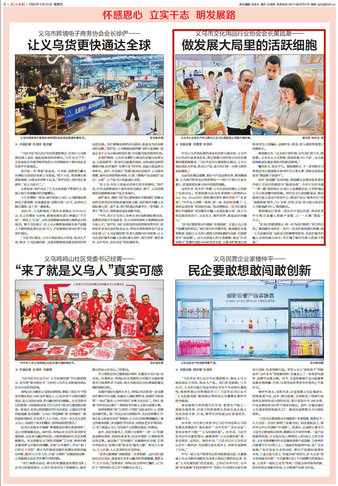 “总书记的重要指示,再一次为我们指明了努力的方向。”黄昌潮目光坚定,“我们一定会沿着他指引的路,把‘义乌发展经验’这块金字招牌擦得更亮,在更好服务和融入全国发展大局中,书写属于新时代商人的奋斗答卷!”