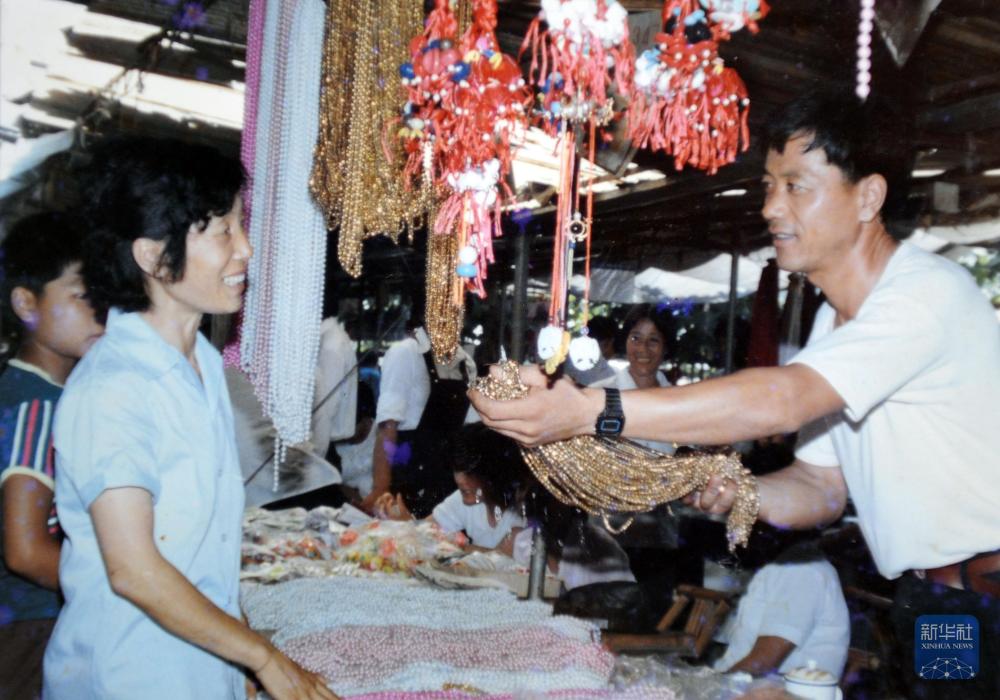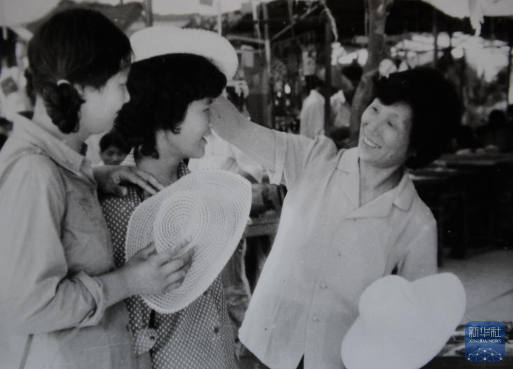 20世纪80年代,冯爱倩(右)在义乌小商品市场向顾客推销遮阳帽。新华社发
