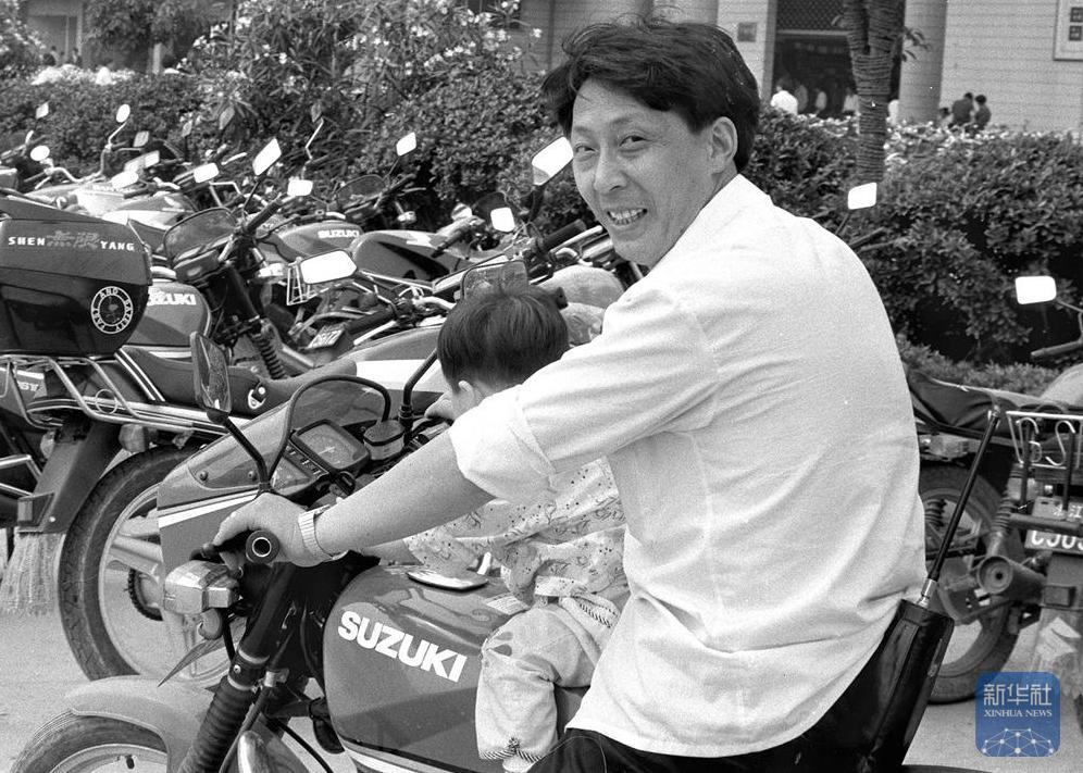 1993年,义乌一名商户骑着摩托车、腰挂“大哥大”。新华社发