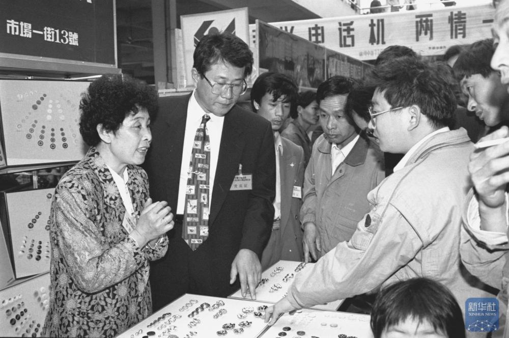 1995年5月18日,首届中国小商品城名优新小商品博览会在浙江义乌市开幕,国内外300余家企业到会展出了千余种名、优、新产品。这是一家韩国钮扣公司的代表在向客商介绍产品。新华社记者蔡志培摄