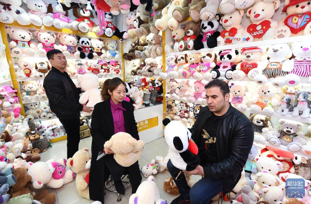 2018年2月27日,阿富汗客商在位于义乌的中国小商品城国际商贸城挑选毛绒玩具。新华社发(龚献明摄)