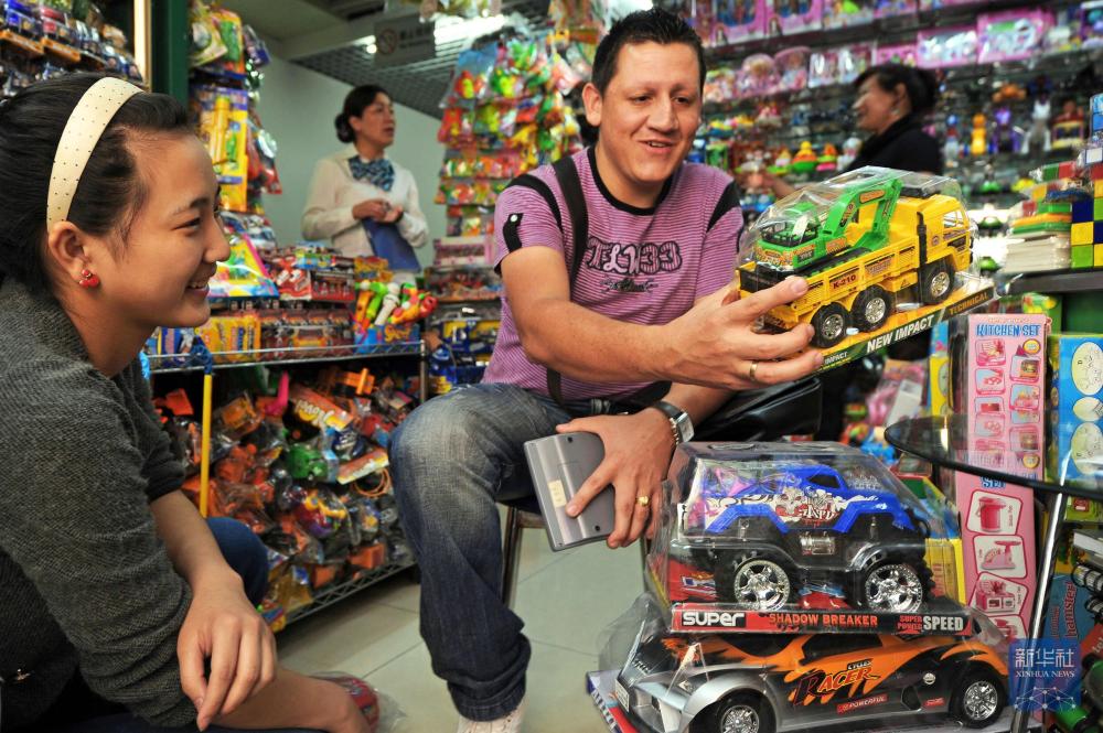 2011年5月16日,玻利维亚客商雨果·阿尔贝托·萨拉查(右)在义乌国际商贸城一家玩具商铺采购汽车玩具。新华社记者谭进摄