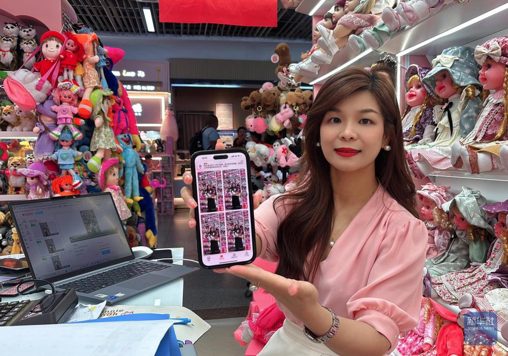 2025年5月21日,义乌国际商贸城一家玩具商铺负责人孙丽娟展示相关AI应用中的多语种视频。孙丽娟是商贸城中最早使用AI(人工智能)做外贸生意的商户之一。新华社发(唐艳清摄)