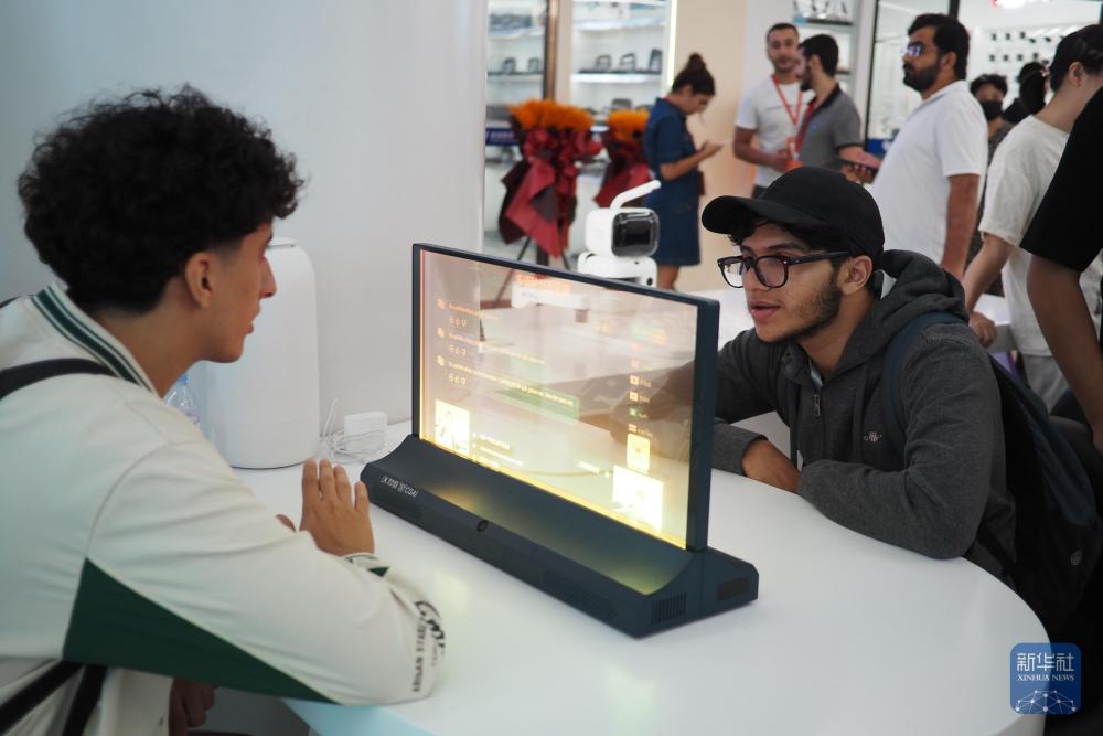 2025年10月14日,两名外籍客商在义乌全球数贸中心体验AI翻译互动屏。新华社记者刘梓漪摄